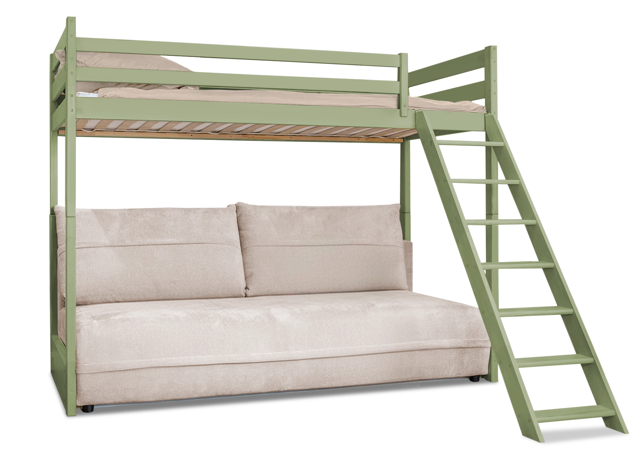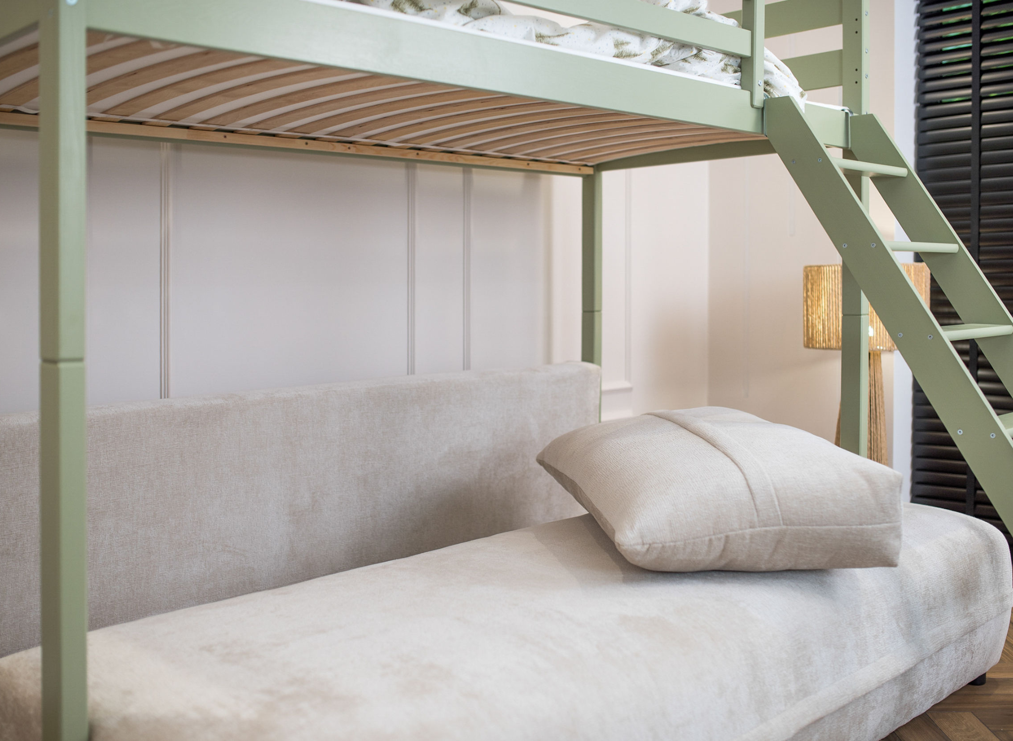 Can our SAVIO loft bed with sofa offer you even more? Absolutely! This single piece of furniture allows you to perfectly organise your child’s room, creating two completely different spaces. When you purchase the bed, you’ll receive two large cushions in the same colour as the sofa, providing a comfortable backrest. The SAVIO model is ideal for a teenager’s bedroom. The spacious sofa, which unfolds to 140x200 cm, makes an excellent spot for studying, hosting friends, or serving as an additional full-size bed. The beige SAVIO sofa will blend beautifully with any colour scheme in your child’s room. At LANO Furniture, we don’t believe in limitations. SAVIO is the perfect choice for siblings of different ages – or even for parents who wish to sleep close to their child or simply have limited space. Invite the upgraded SAVIO loft bed into your home today and enjoy this LANO Furniture bestseller at its finest!