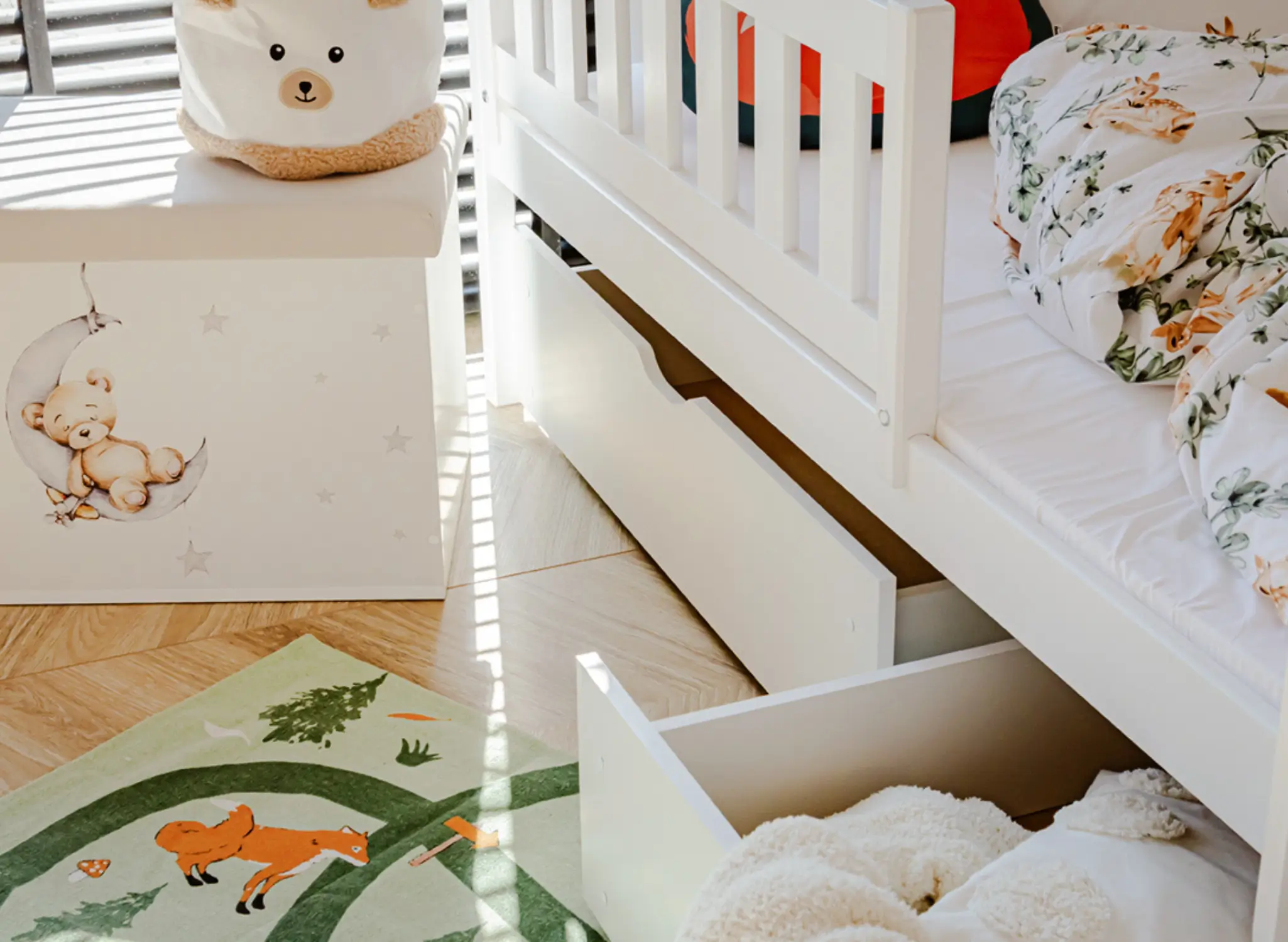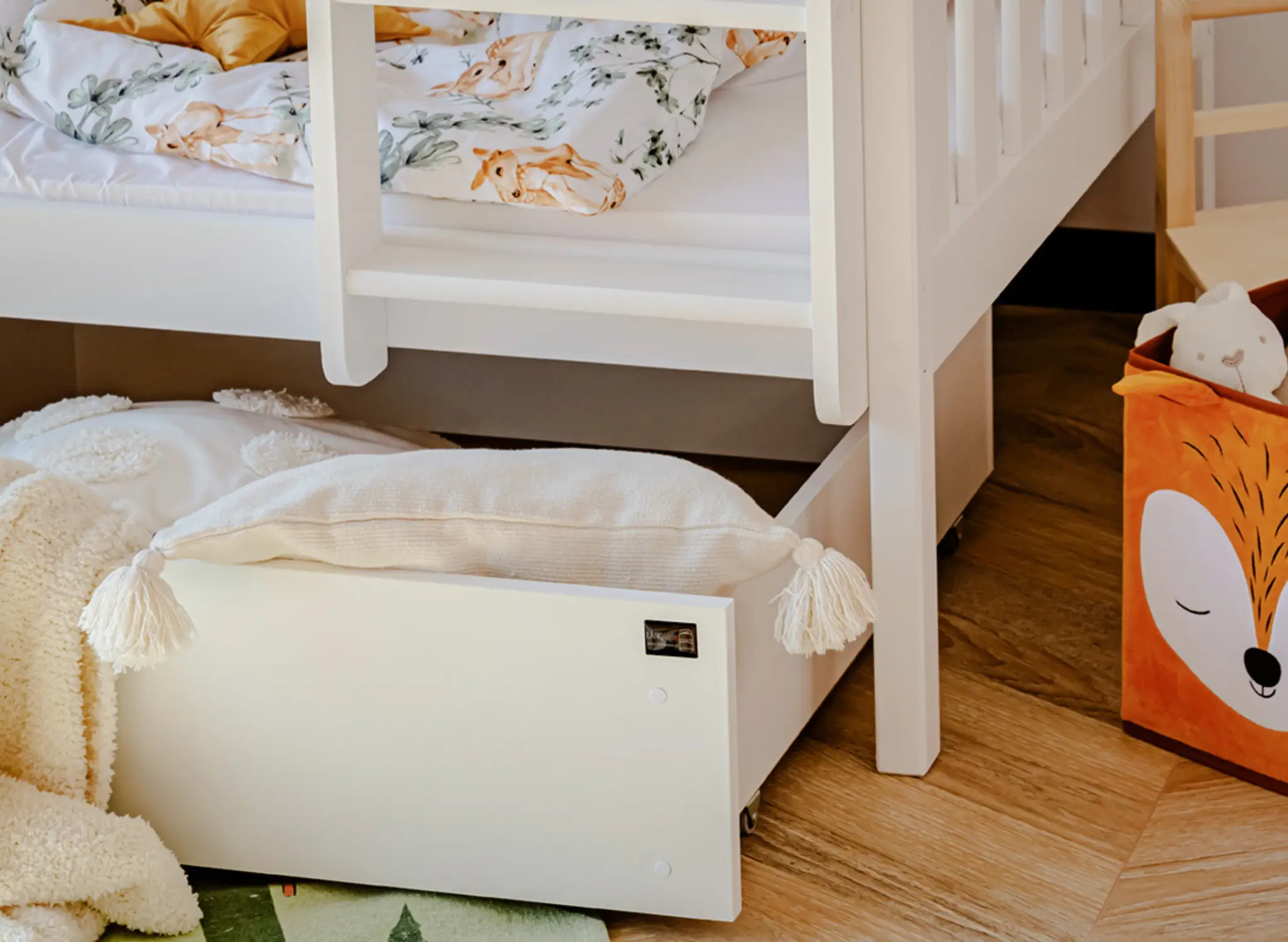 Miejsca do przechowywania nigdy dość. My również wychodzimy z takiego założenia, dlatego nasze łóżka są nie tylko pięknie i solidne, ale też praktyczne. Zamawiając łóżko piętrowe IGNAŚ, możesz dobrać pasujące stylem i charakterem szuflady. Ich szerokość i wysokość sprawia, że bez trudu schowasz tam zapasową pościel swoich dzieci. Szuflady wyposażone są w kółka, co znacząco ułatwia ich wysuwanie spod łóżek, a minimalistyczny uchwyt dodaje szufladom elegancji. Piętrowe łóżko IGNAŚ od Lano Meble, dostosowane jest do potrzeb również młodszych dzieci. Obydwie części łóżka wyposażone są w drewnianą barierkę, dlatego nawet te maleństwa, które śpią niespokojnie i podczas snu się wiercą, są bezpieczne. Jednak to nie wszystko, gdy Twoje dzieci podrosną, to z dolnej części szybko zdemontujesz barierkę, co ułatwi wchodzenie i schodzenie z łóżka.