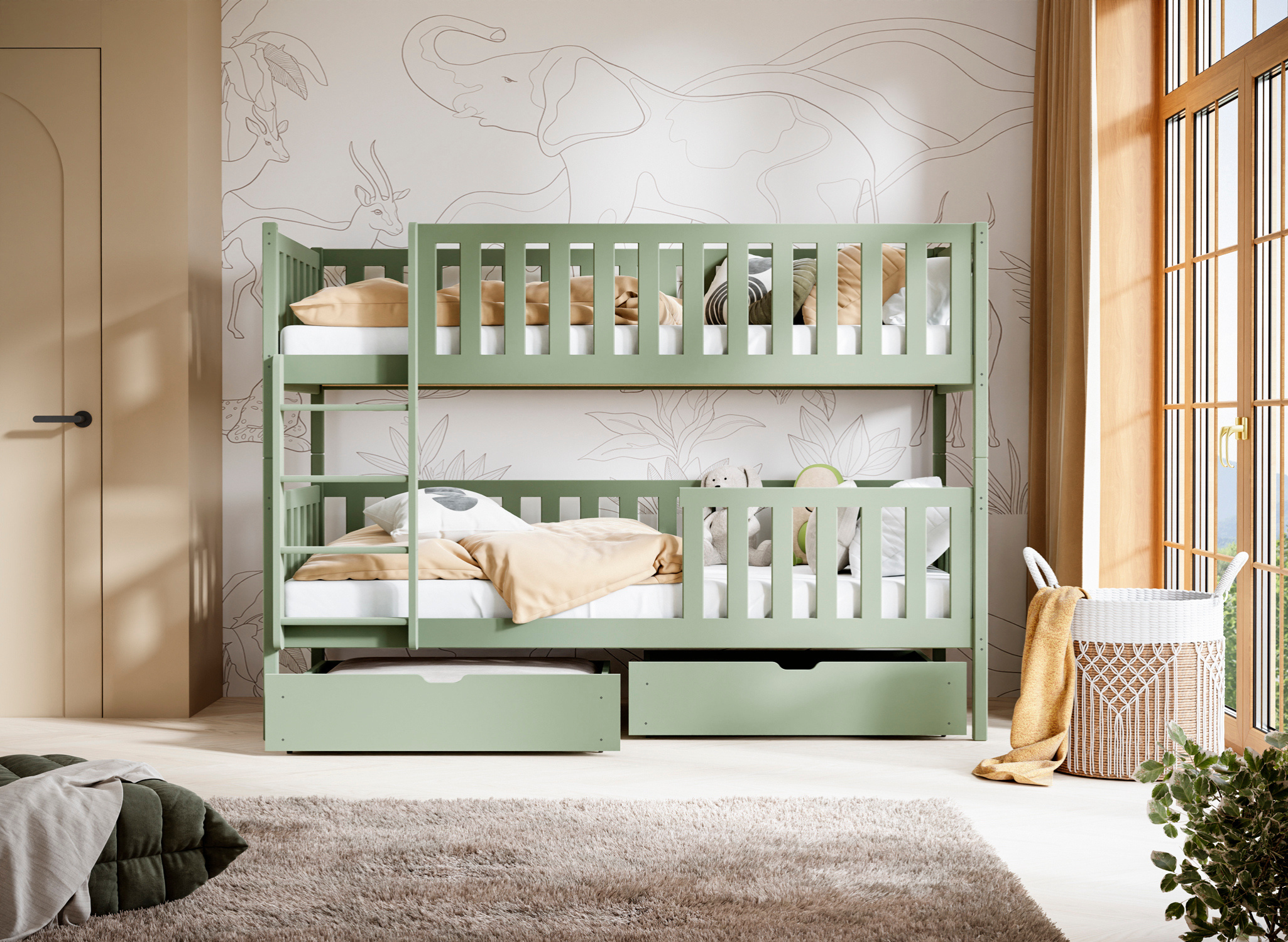 Duże szuflady – opcje oliwkowego łóżka dziecięcego MICHALINA, które uczynią Twoje życie łatwiejszym