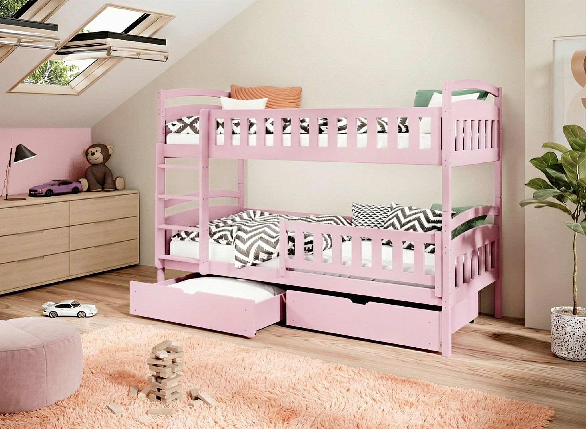Różowe łóżko piętrowe IGNAŚ pomoże Ci utrzymać porządek w pokoju Twojego dziecka