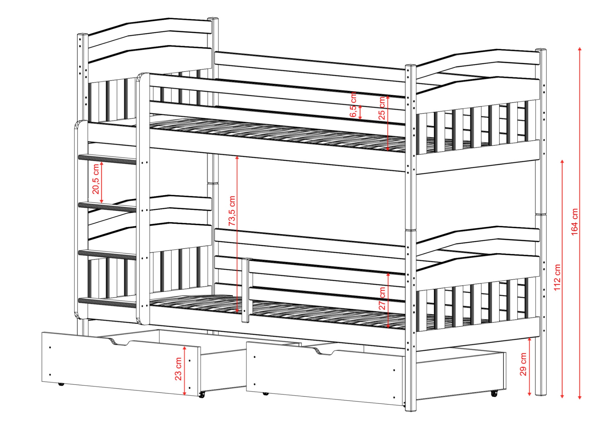 Łóżko dziecięce GABI to idealny wybór, kiedy masz dwójkę dzieci. Zadbaliśmy tu o niepowtarzalny, magiczny design. Pokój dziecięcy nabierze zupełnie nowego klimatu. Łóżko piętrowe GABI jest wykonane naprawdę solidnie. Wykorzystaliśmy specjalne barierki dla bezpieczeństwa dziecka i uniwersalną drabinkę. Do naszego łóżka dziecięcego GABI można samodzielnie wybrać materace do spania – tak jak kilka innych parametrów oraz elementów łóżka. Łóżko piętrowe GABI to propozycja, która sprosta nawet największym wymaganiom. Ta propozycja wyróżnia się pod wieloma względami. Łóżko piętrowe GABI wykonaliśmy z solidnego, wysokiej jakości drewna sosnowego – zapewnia to wytrzymałość. Drewniane barierki oraz uniwersalna drabinka, należą do kolejnych, ważnych zalet. GABI to łóżko z szufladami, gdzie można umieścić na przykład zabawki, poduszki, kołdrę czy pościel. Warto również zauważyć, że umożliwiamy w tym przypadku personalizację. Łóżko piętrowe GABI może zostać przystosowane wedle Twoich preferencji.