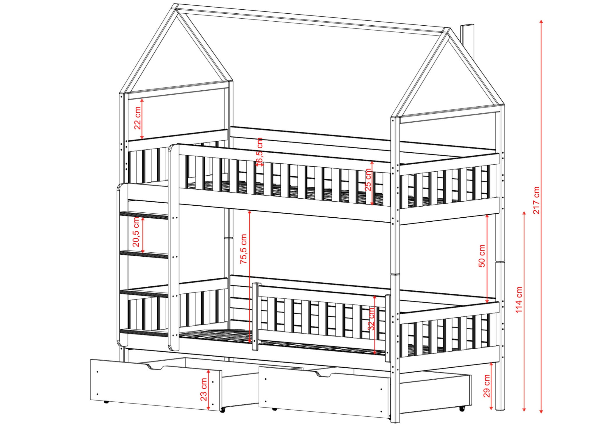Dodatkowe miejsce do przechowywania w postaci funkcjonalnych szuflad z bezpiecznymi gumowymi kółeczkami, uniwersalne barierki i drabinki. Wszystko to i wiele więcej, może być Twoje, jeśli zdecydujesz się na łóżko piętrowe domek GAJA od Lano Meble. Zafunduj swojemu maluchowi najlepsze lata dzieciństwa, dbając o jego prawidłowy i bezpieczny sen.