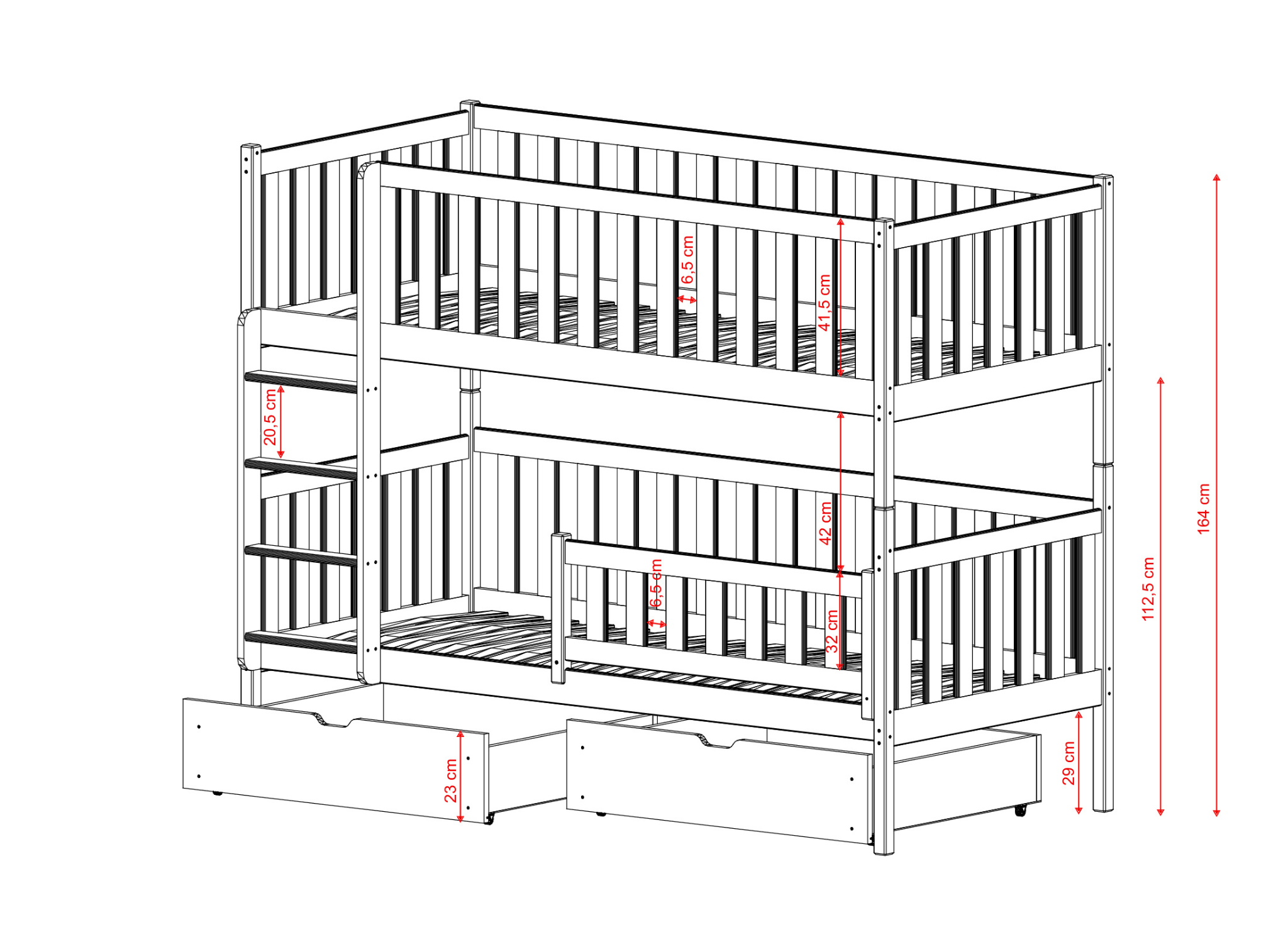 Wszystkie łóżka od Lano Meble są pozbawione ostrych kantów, aby Twoje dzieci zawsze były bezpieczne podczas snu. Łóżko piętrowe MICHALINA zostało również wyposażone w wysokie barierki ochronne, a więc nawet najbardziej aktywnym maluchom nie będzie groził upadek. Szeroka i wygodna drabinka ułatwia wspinaczkę na górne piętro. Rama łóżka jest w całości wykonana z sosnowego drewna, które cechuje się dobrą sprężystością oraz wytrzymałością i nie wymaga zaawansowanej pielęgnacji. W Lano Meble dbamy o zdrowie Twoich pociech, dlatego bez względu na to, jaki kolor łóżka wybierzesz, rama będzie pokryta wodną, antyalergiczną farbą. Łóżko piętrowe MICHALINA charakteryzuje się klasycznym wzornictwem. Łatwo dopasujesz ją do aranżacji wnętrza pokoju dziecięcego. Dla młodszych dzieci w wieku od 2 lat dobrą opcją zapewniającą wysoki poziom bezpieczeństwa jest łóżko piętrowe MICHALINA z barierką wbudowaną na stałe. Natomiast dla nieco starszych pociech lepszym rozwiązaniem może być barierka zdejmowana.