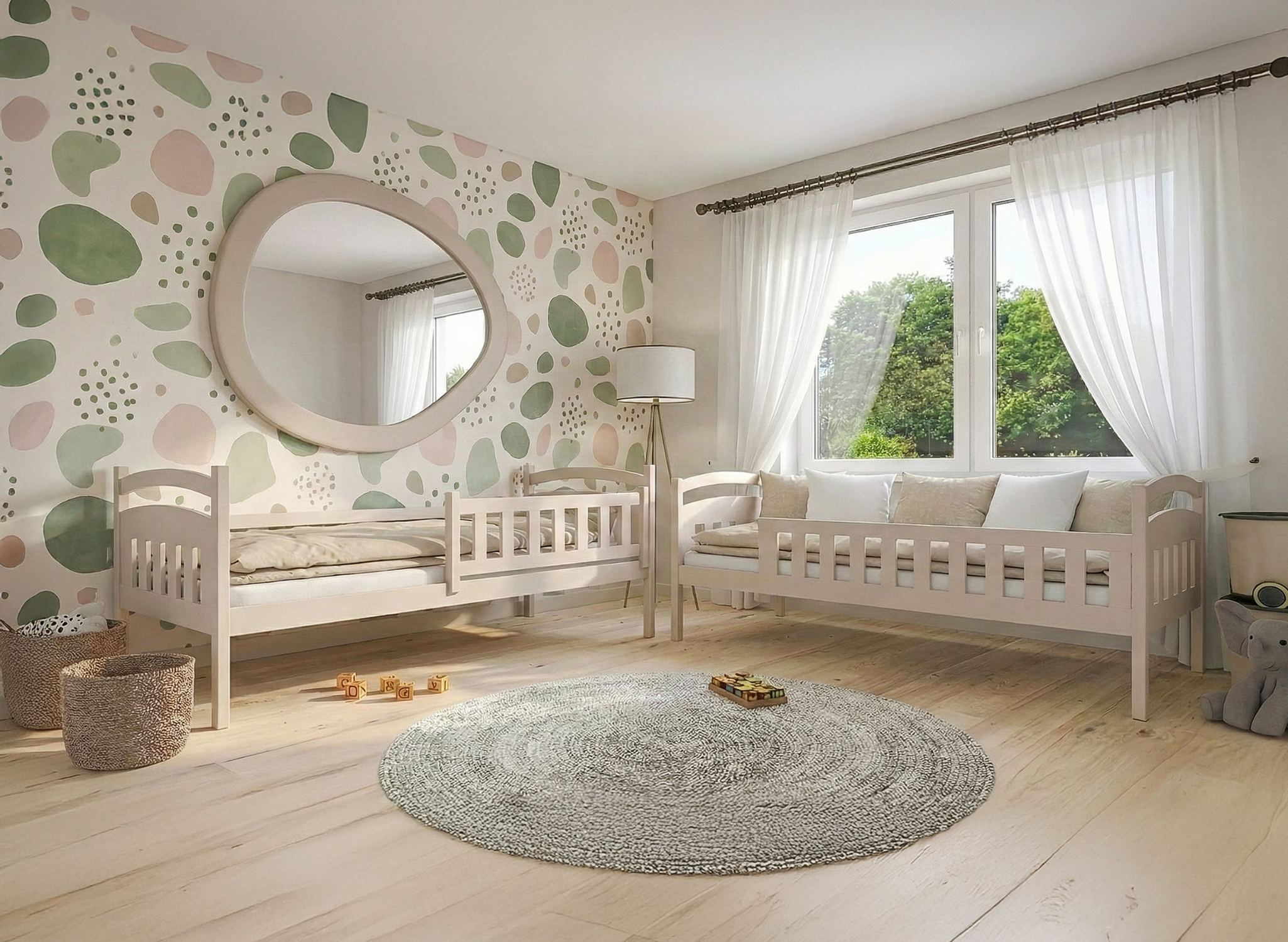 Jeżeli masz w domu rodzeństwo, które dzieli ze sobą pokój, to jesteśmy pewni, że marzą oni o piętrowym łóżku IGNAŚ. Minimalistyczny design, wygodna drabina i barierki na obydwu łóżkach sprawiają, że jest to mebel, na którym mogą spać również młodsze dzieci. Nasze piętrowe łóżko IGNAŚ, jest stworzone z dbałością o każdy, nawet najmniejszy detal. Zaokrąglone brzegi sprawiają, że Twoje dzieci nawet podczas najbardziej szalonej zabawy nie zrobi sobie krzywdy. Zarówno łóżko górne, jak i dolne wyposażone jest w drewnianą barierkę, która zabezpiecza najmłodsze dzieci przed przypadkowym wypadnięciem z łóżka podczas snu.