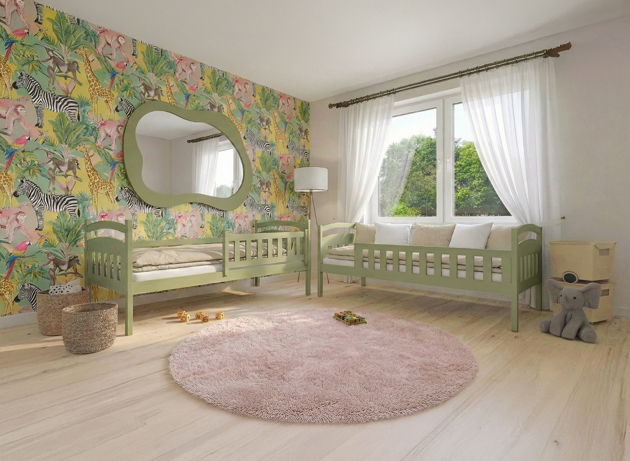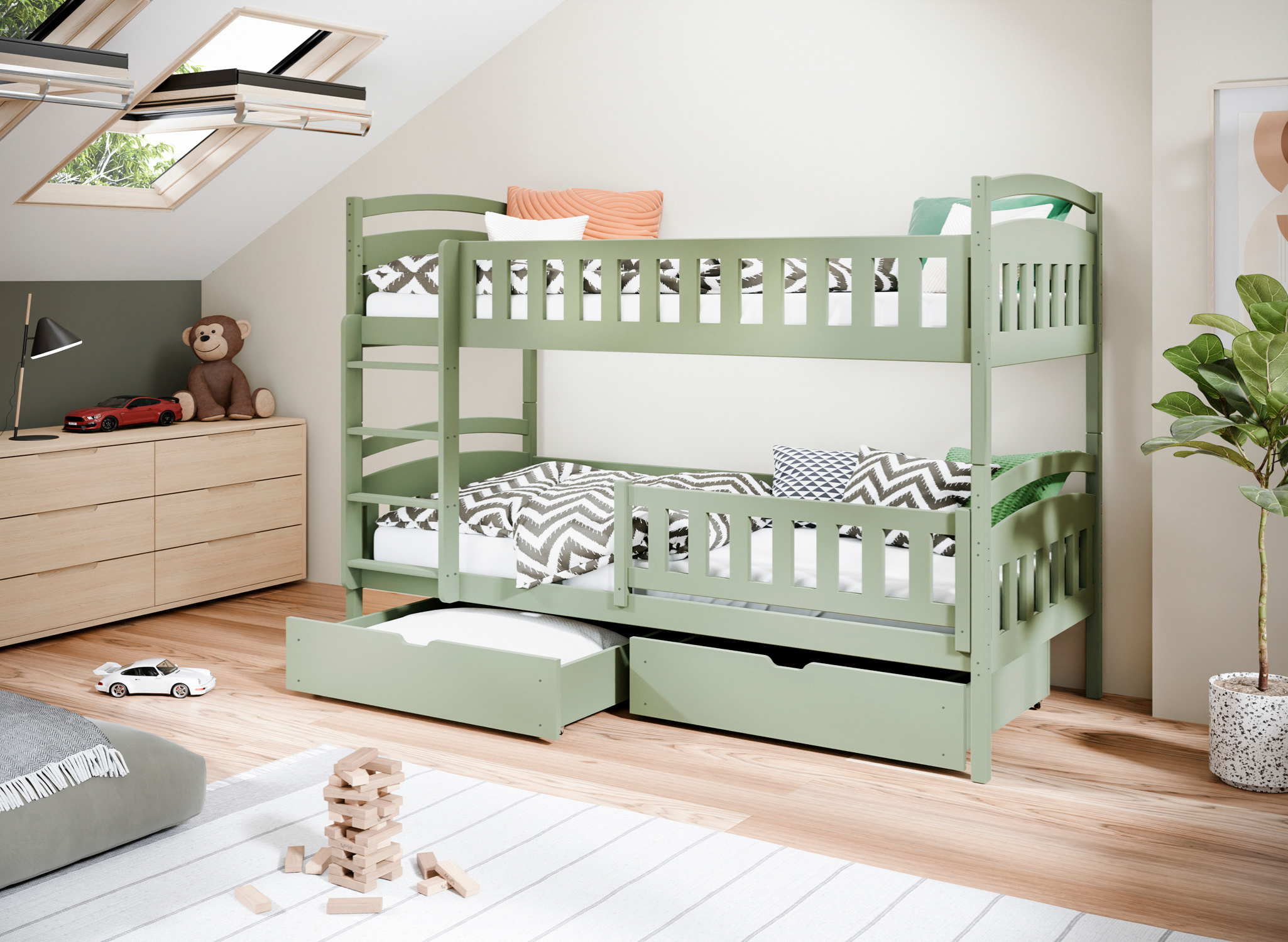 Klasyczne i wytrzymałe oliwkowe łóżko piętrowe IGNAŚ 80x200 w pokoju Twoich dzieci