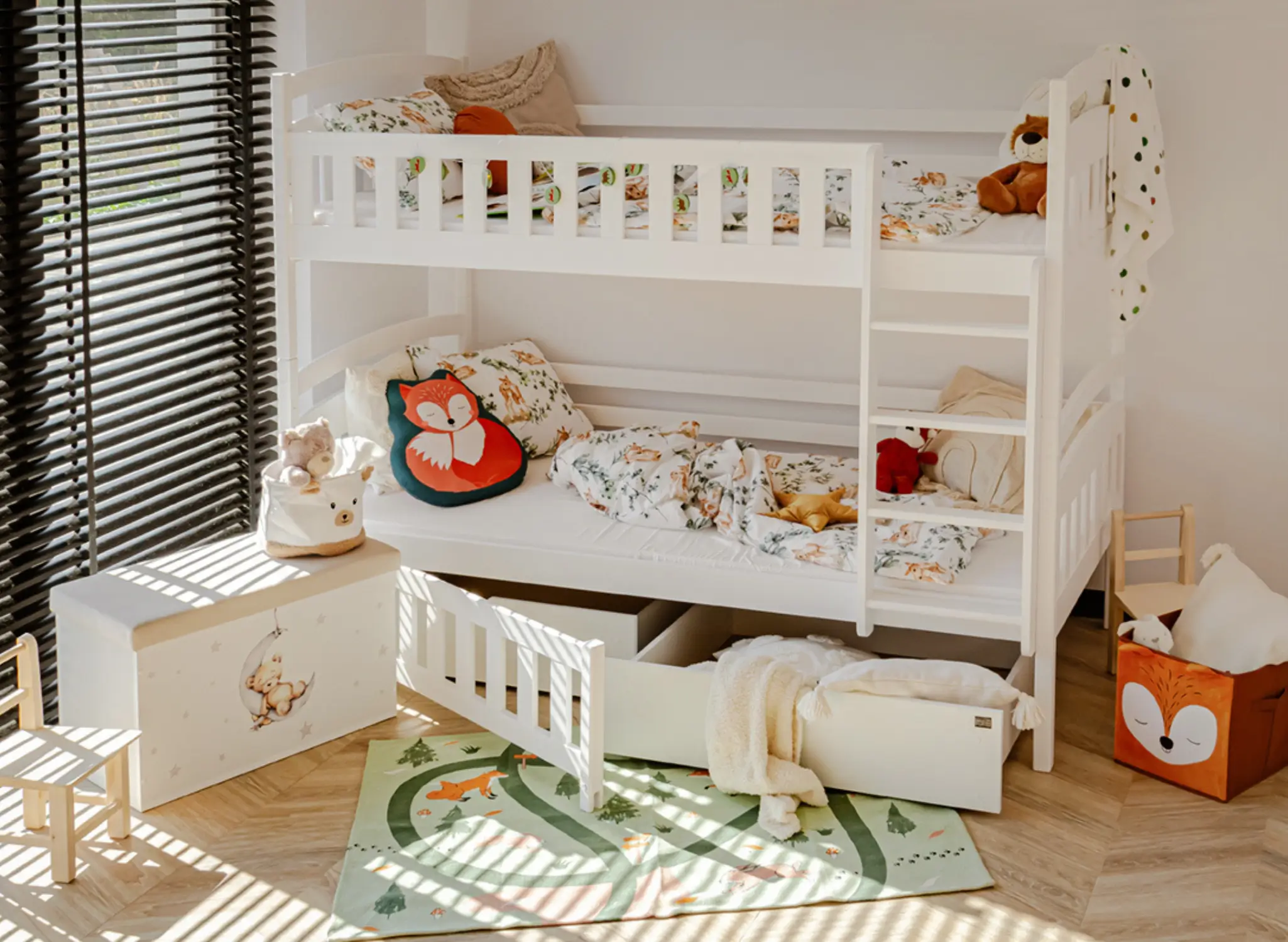 Miejsca do przechowywania nigdy dość. My również wychodzimy z takiego założenia, dlatego nasze łóżka są nie tylko pięknie i solidne, ale też praktyczne. Zamawiając łóżko piętrowe IGNAŚ, możesz dobrać pasujące stylem i charakterem szuflady. Ich szerokość i wysokość sprawia, że bez trudu schowasz tam zapasową pościel swoich dzieci. Szuflady wyposażone są w kółka, co znacząco ułatwia ich wysuwanie spod łóżek, a minimalistyczny uchwyt dodaje szufladom elegancji. Piętrowe łóżko IGNAŚ od Lano Meble, dostosowane jest do potrzeb również młodszych dzieci. Obydwie części łóżka wyposażone są w drewnianą barierkę, dlatego nawet te maleństwa, które śpią niespokojnie i podczas snu się wiercą, są bezpieczne. Jednak to nie wszystko, gdy Twoje dzieci podrosną, to z dolnej części szybko zdemontujesz barierkę, co ułatwi wchodzenie i schodzenie z łóżka.