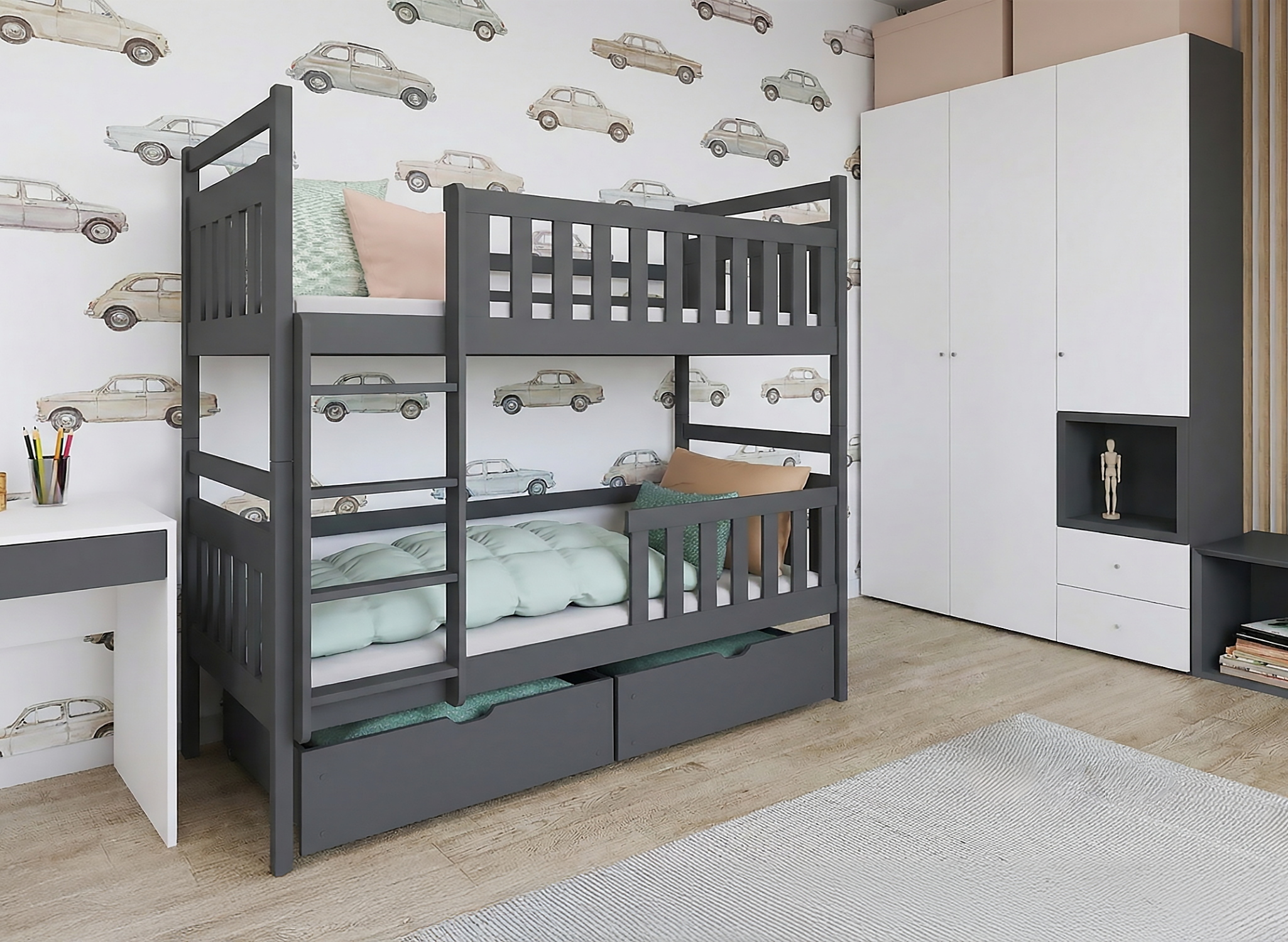 Design, który pokochali rodzice i maluchy – grafitowe piętrowe łóżko MONIKA