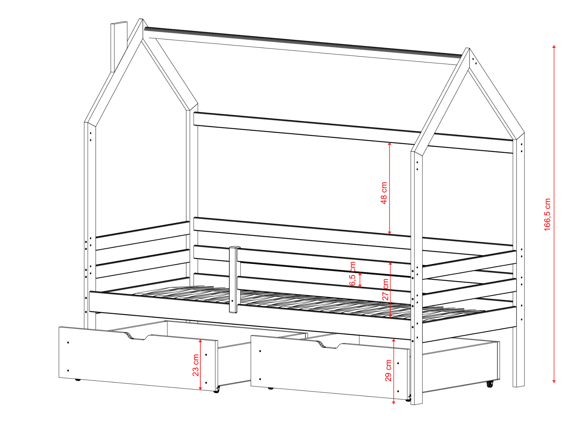 W Lano Meble dbamy o bezpieczeństwo i zdrowie Twojego dziecka, dlatego nasze łóżka dziecięce są produkowane z naturalnego drewna sosnowego i pokrywane atestowanymi farbami. Wiemy o tym, że spokojny sen to podstawa rozwoju każdego malucha. W naszych meblach znajdziesz wyłącznie materiały najwyższej jakości. Sprawdź, co ma do zaoferowania łóżko dziecięce domek LILA i jakie są jego największe atuty. Stelaż łóżka dziecięcego LILA typu domek został w pełni wykonany z drewna sosnowego. U góry znajduje się drewniana rama, która swoim kształtem przypomina dach, a na dole listwa brzozowa, stanowiąca stelaż pod materac. Do dyspozycji masz również dwie pojemne szuflady, które pełnią funkcję praktycznego schowka na pościel oraz zabawki. Dzięki naszemu łóżko dziecięcemu LILA typu domek zyskasz dodatkową przestrzeń w dziecięcym pokoju.
