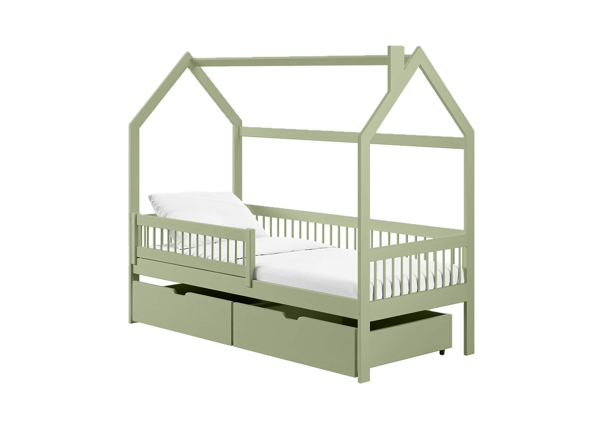 Pojemne szuflady oliwkowego łóżka dziecięcego domek OSKAR na wszystkie skarby