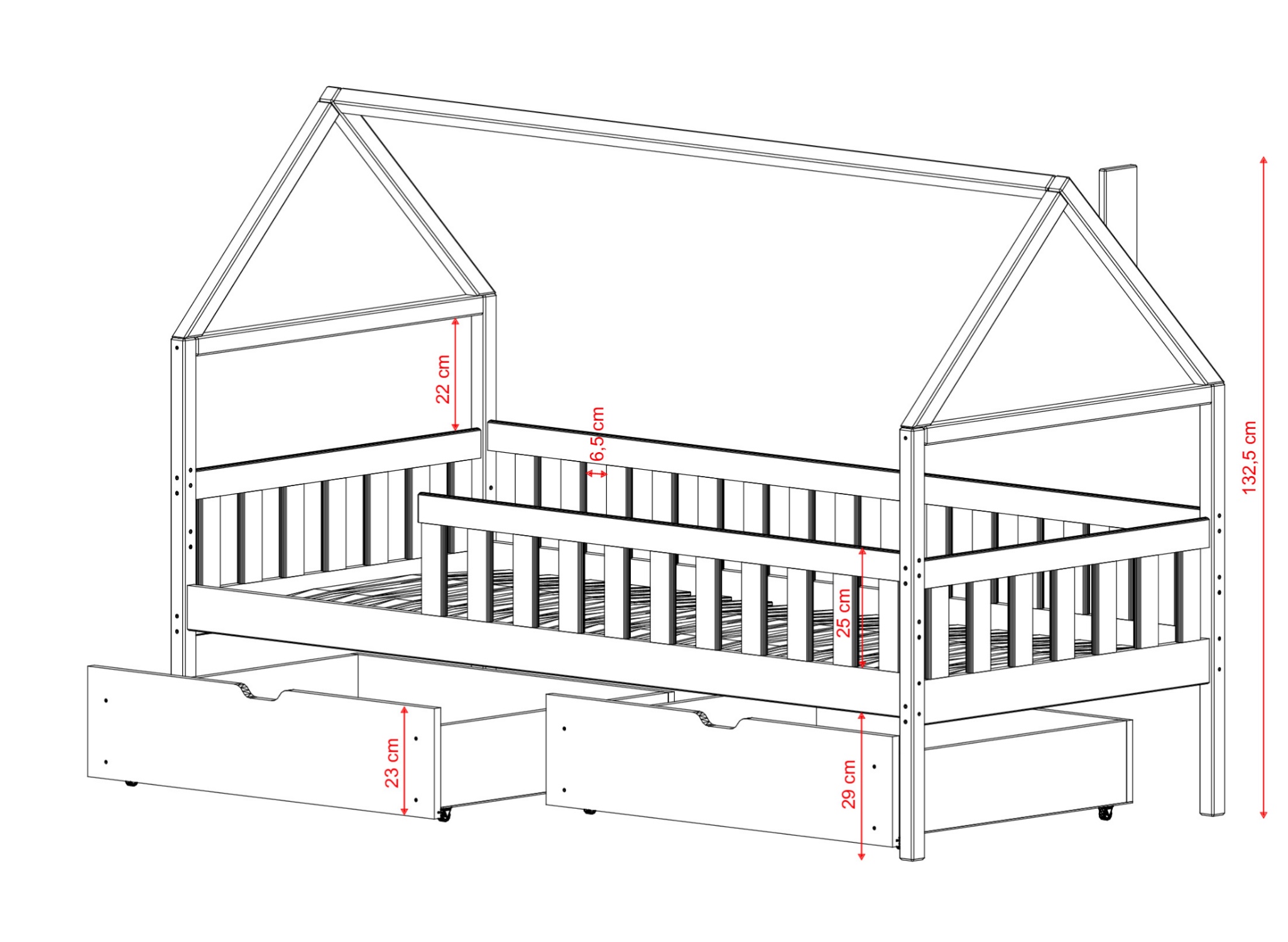 Wszystkie nasze produkty spełniają najwyższe standardy bezpieczeństwa przewidziane dla mebli dziecięcych. Do produkcji tego modelu wykorzystaliśmy drewno sosnowe, które nie tylko jest trwałe, ale też pochodzi z odpowiedzialnej gospodarki leśnej. Tym samym łóżko-domek DOMI cechuje się ekologicznym charakterem. Możemy pomalować je na taki kolor, jaki tylko wymarzy sobie Twoja pociecha – i zrobimy to przy użyciu nietoksycznych lakierów. W pokoju dziecięcym zawsze brakuje miejsca do przechowywania – czy to zabawek, czy też zimowych ubrań lub zapasowych kompletów pościeli. Ten model mebla dziecięcego można wyposażyć w dwie wysuwane szuflady o sporej pojemności, które na pewno się przydadzą.