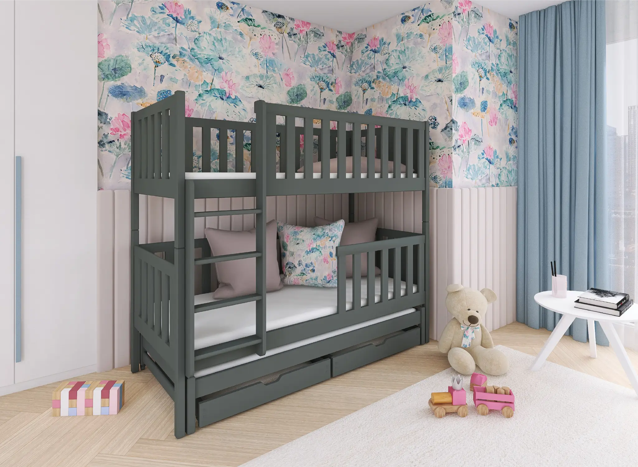 Nadzwyczaj wygodne, niezwykle praktyczne – grafitowe łóżko piętrowe LEA