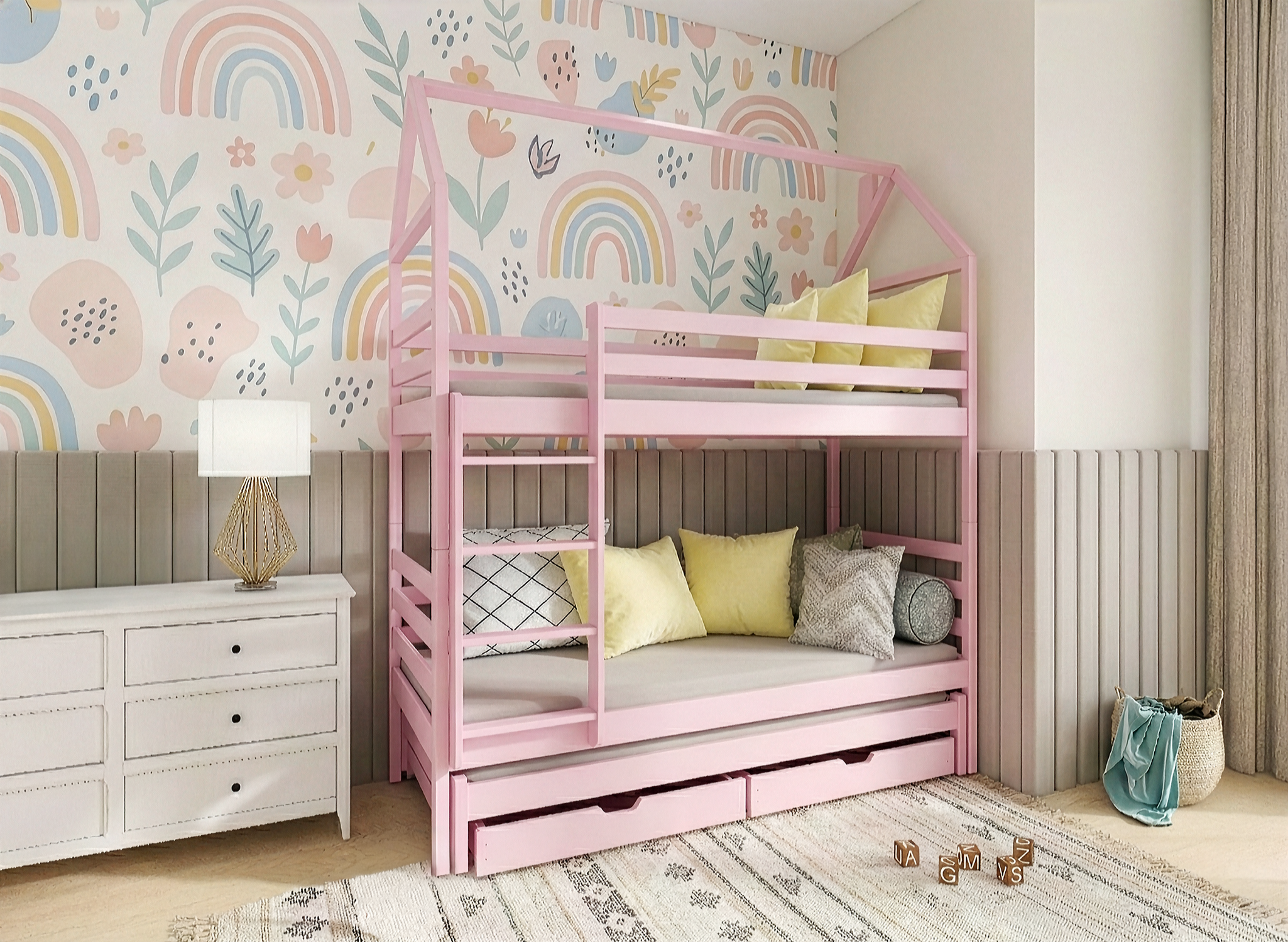 Łóżka piętrowe domek DALIA to nie tylko dobry pomysł na zaaranżowanie niewielkiego pokoju dziecięcego, ale i miejsce kreatywnej zabawy. À propos zabawy – jeśli brakuje Ci miejsca na gry, zabawki czy inne dziecięce przedmioty, to łóżko piętrowe typu domek DALIA ma dla Ciebie rozwiązanie. Mebel posiada dwie pojemne szuflady do przechowywania, które pomogą w utrzymaniu porządku w pomieszczeniu.