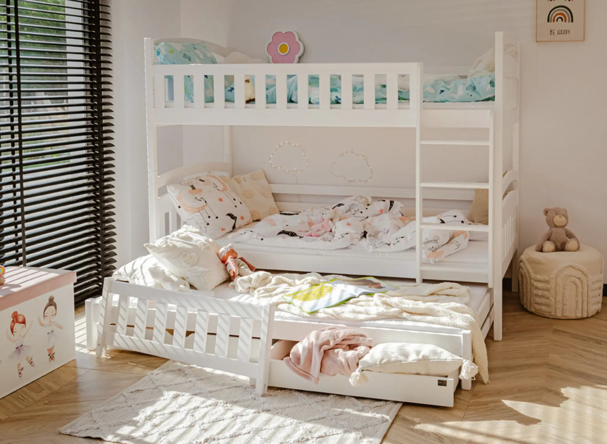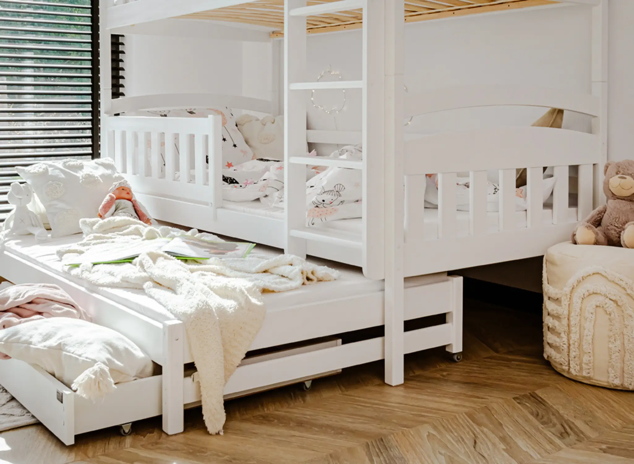 U dołu łóżka piętrowego trzyosobowego BLANKA mogą znajdować się wysuwane szuflady, jeśli tylko zdecydujesz się na taki wariant. Ich pojemne wnętrze pomieści wiele rzeczy, które zagracają przestrzeń w pokoju dziecka, np. dawno nieużywane zabawki lub koce, po które sięgasz tylko zimą. Dodatkowy, wysuwany materac u dołu stanie się nieocenioną pomocą, gdy dziecko zaprosi na noc przyjaciół na wielkie nocowanie – zapewni gościom komfort bez konieczności sięgania po dodatkowe dmuchane materace.