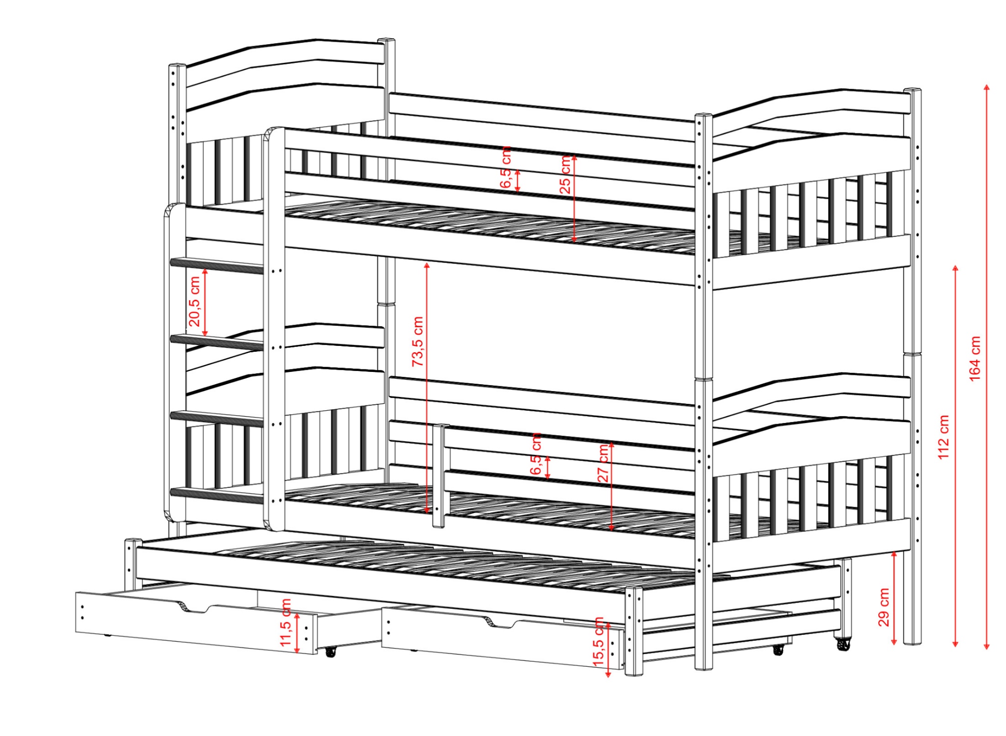 Łóżko piętrowe trzyosobowe ALAN sprawdzi się perfekcyjnie, jeśli chcesz stworzyć komfortowe warunki do snu dla trójki rodzeństwa. Trzy powierzchnie do spania o niemal równych wymiarach zapewnią każdemu dziecku optymalny komfort w nocy, niezależnie od tego, na którym poziomie śpi. Trzeci materac może być też dodatkową opcją dla gości lub miejscem, w których maluchy będą się bawić, żeby nie zostawiać zabawek w pościeli.