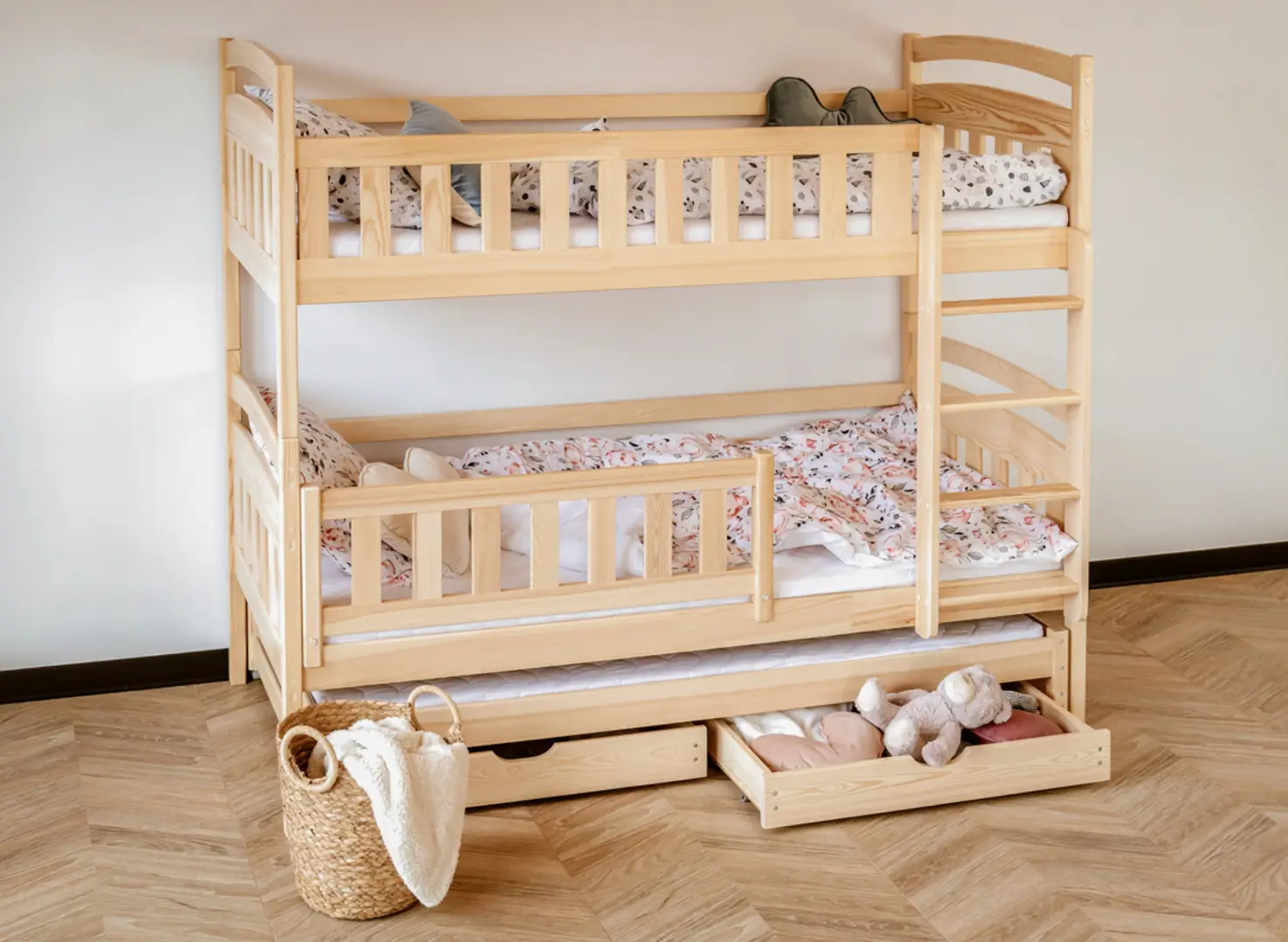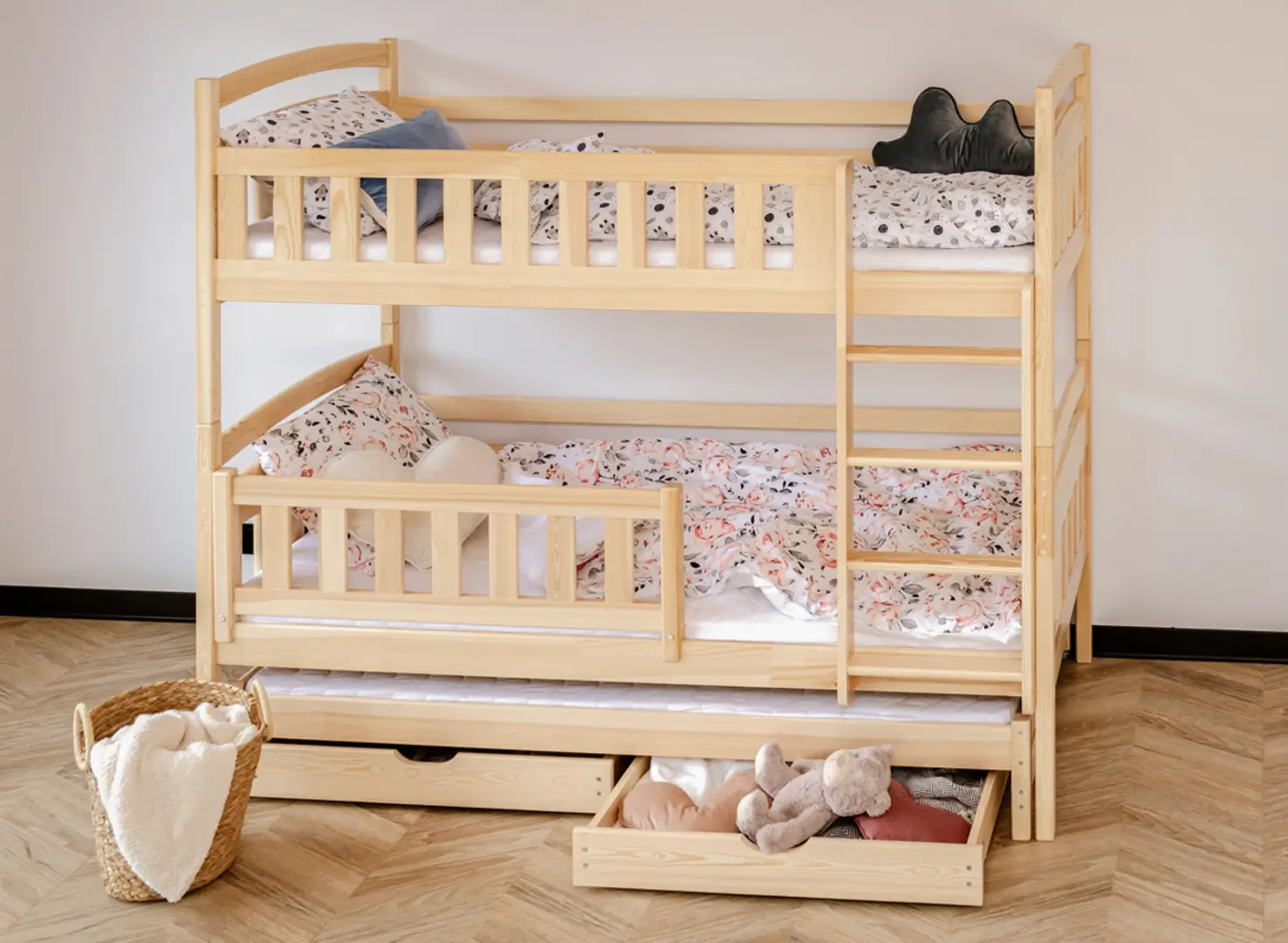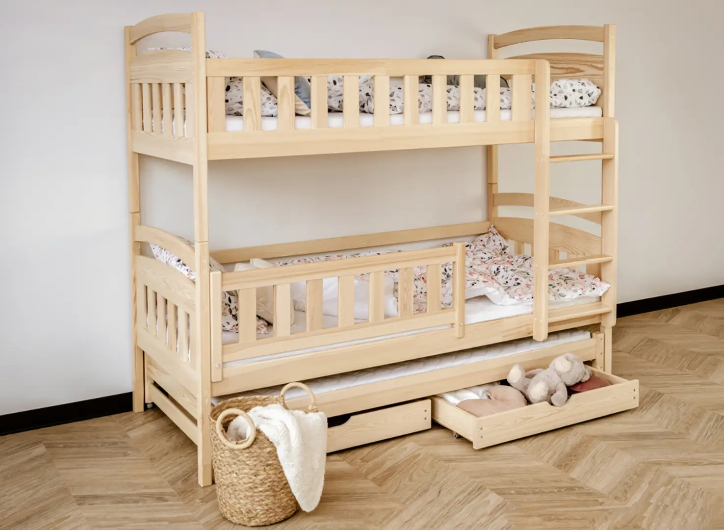 U dołu łóżka piętrowego trzyosobowego BLANKA mogą znajdować się wysuwane szuflady, jeśli tylko zdecydujesz się na taki wariant. Ich pojemne wnętrze pomieści wiele rzeczy, które zagracają przestrzeń w pokoju dziecka, np. dawno nieużywane zabawki lub koce, po które sięgasz tylko zimą. Dodatkowy, wysuwany materac u dołu stanie się nieocenioną pomocą, gdy dziecko zaprosi na noc przyjaciół na wielkie nocowanie – zapewni gościom komfort bez konieczności sięgania po dodatkowe dmuchane materace.