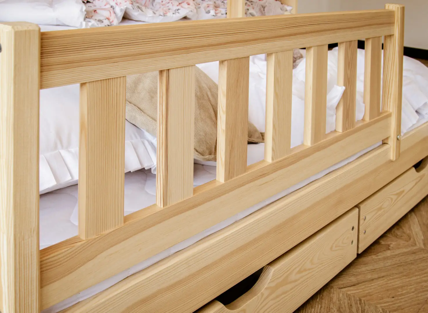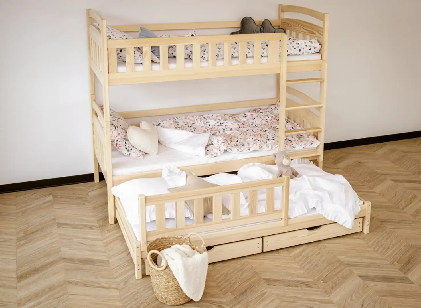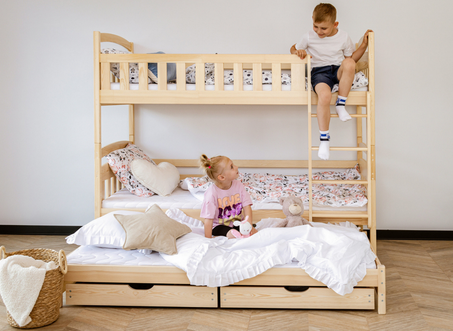 U dołu łóżka piętrowego trzyosobowego BLANKA mogą znajdować się wysuwane szuflady, jeśli tylko zdecydujesz się na taki wariant. Ich pojemne wnętrze pomieści wiele rzeczy, które zagracają przestrzeń w pokoju dziecka, np. dawno nieużywane zabawki lub koce, po które sięgasz tylko zimą. Dodatkowy, wysuwany materac u dołu stanie się nieocenioną pomocą, gdy dziecko zaprosi na noc przyjaciół na wielkie nocowanie – zapewni gościom komfort bez konieczności sięgania po dodatkowe dmuchane materace.
