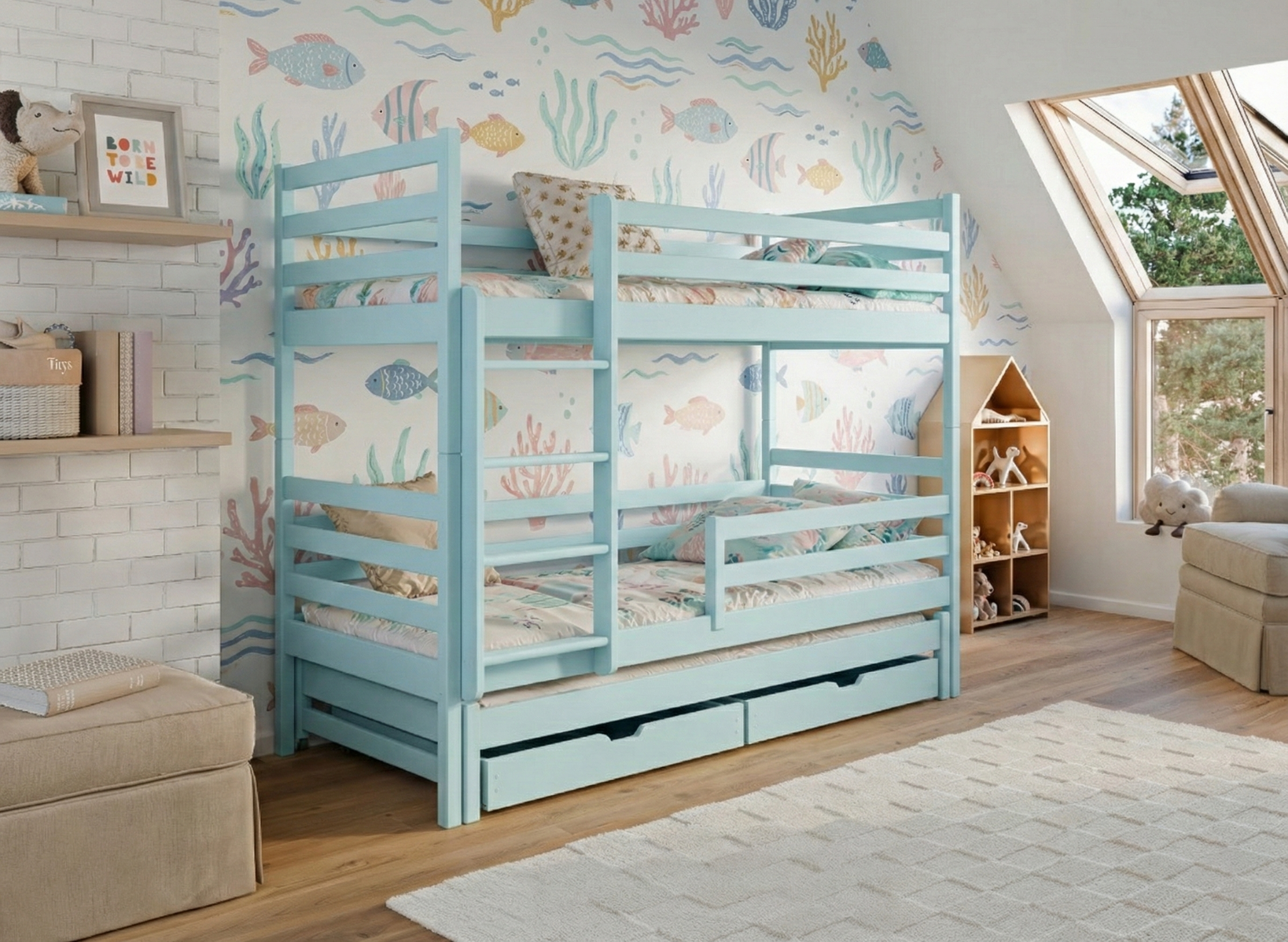 Klasyczne niebieskie łóżko piętrowe LUK dopasuje się do każdego wnętrza