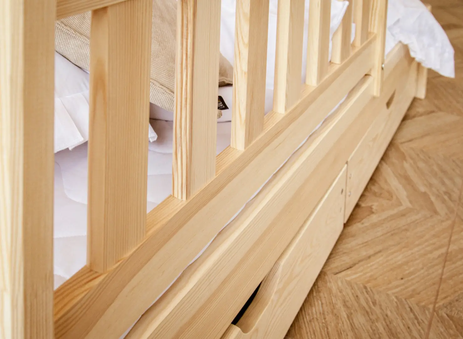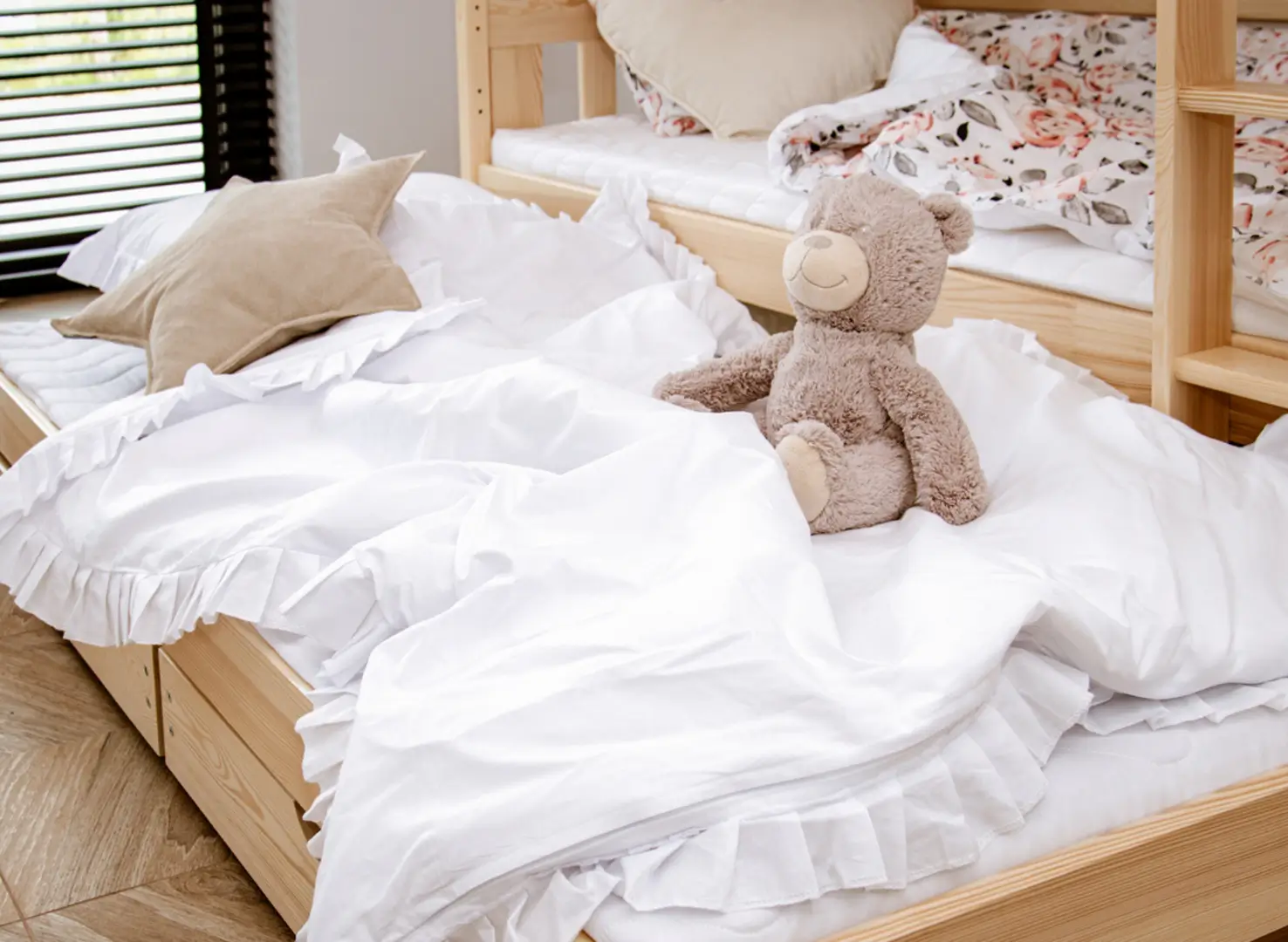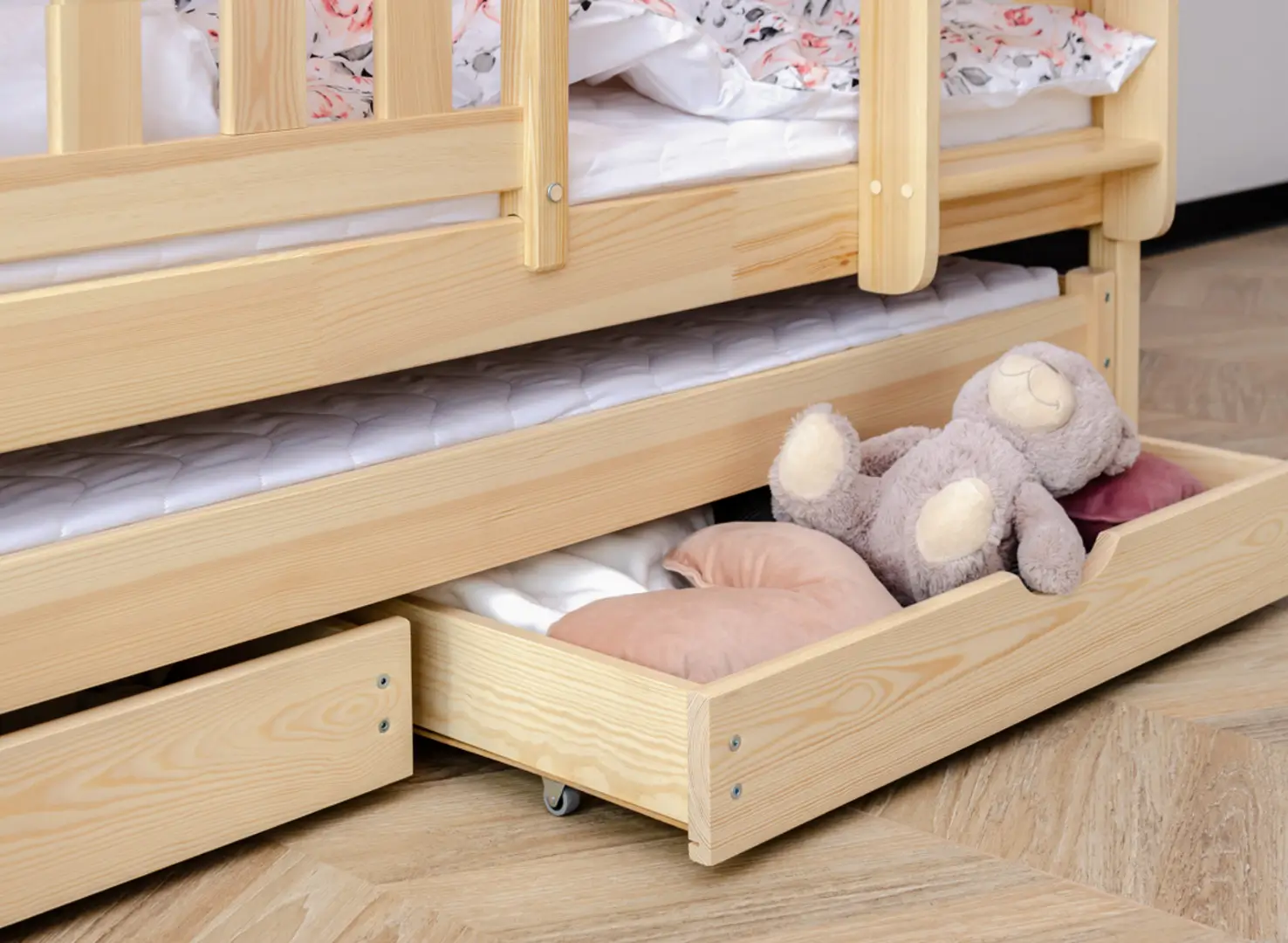 U dołu łóżka piętrowego trzyosobowego BLANKA mogą znajdować się wysuwane szuflady, jeśli tylko zdecydujesz się na taki wariant. Ich pojemne wnętrze pomieści wiele rzeczy, które zagracają przestrzeń w pokoju dziecka, np. dawno nieużywane zabawki lub koce, po które sięgasz tylko zimą. Dodatkowy, wysuwany materac u dołu stanie się nieocenioną pomocą, gdy dziecko zaprosi na noc przyjaciół na wielkie nocowanie – zapewni gościom komfort bez konieczności sięgania po dodatkowe dmuchane materace.