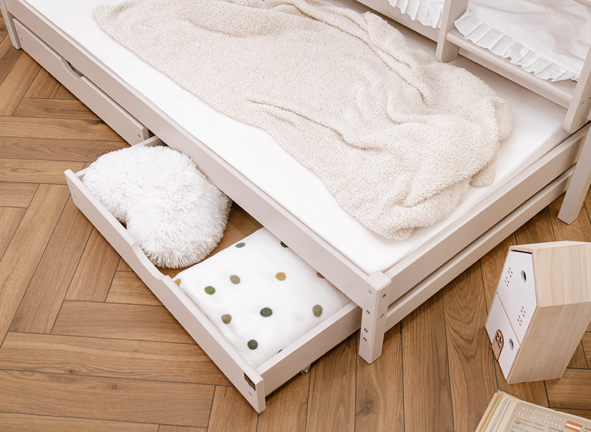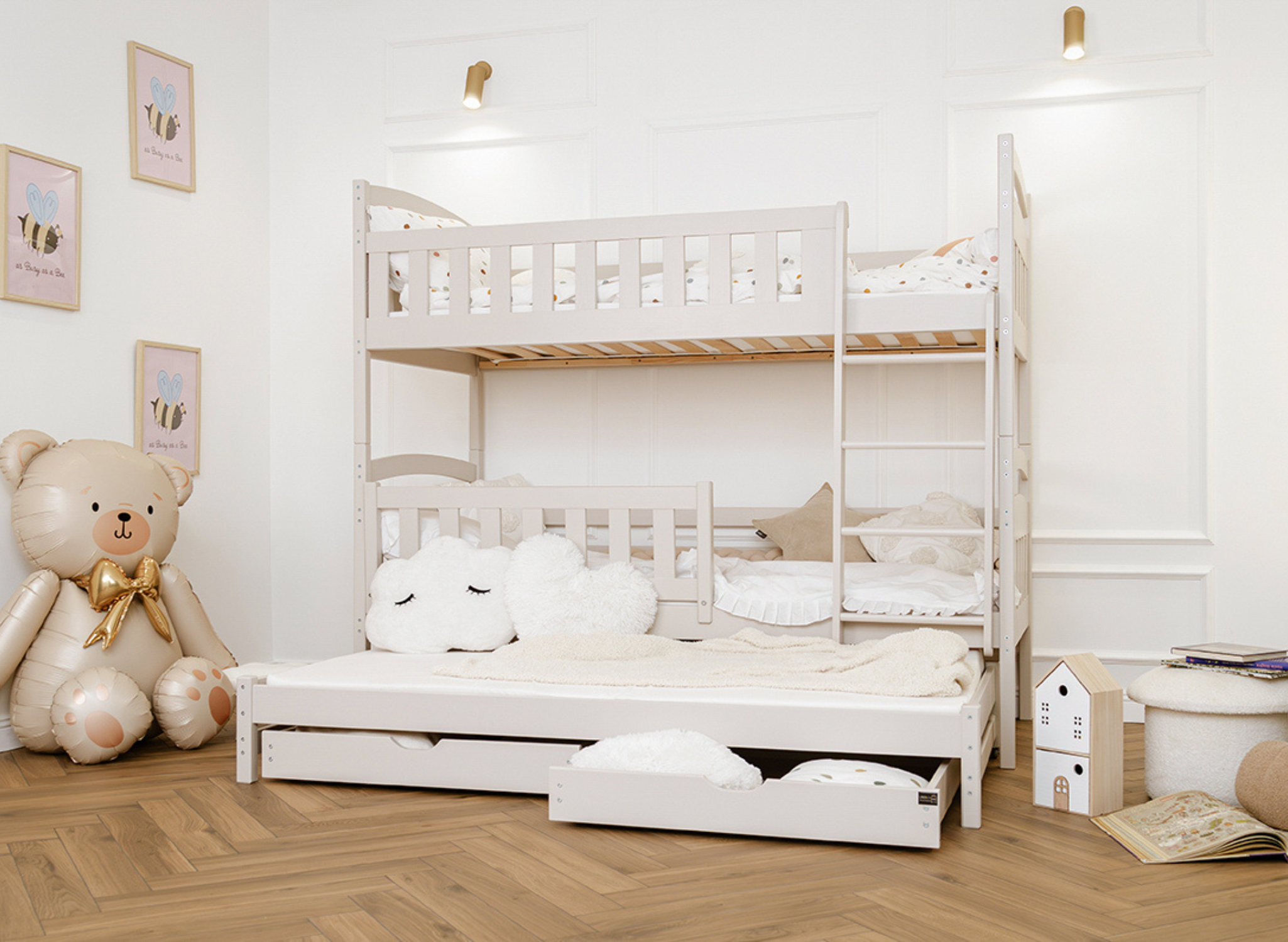 U dołu łóżka piętrowego trzyosobowego BLANKA mogą znajdować się wysuwane szuflady, jeśli tylko zdecydujesz się na taki wariant. Ich pojemne wnętrze pomieści wiele rzeczy, które zagracają przestrzeń w pokoju dziecka, np. dawno nieużywane zabawki lub koce, po które sięgasz tylko zimą. Dodatkowy, wysuwany materac u dołu stanie się nieocenioną pomocą, gdy dziecko zaprosi na noc przyjaciół na wielkie nocowanie – zapewni gościom komfort bez konieczności sięgania po dodatkowe dmuchane materace.