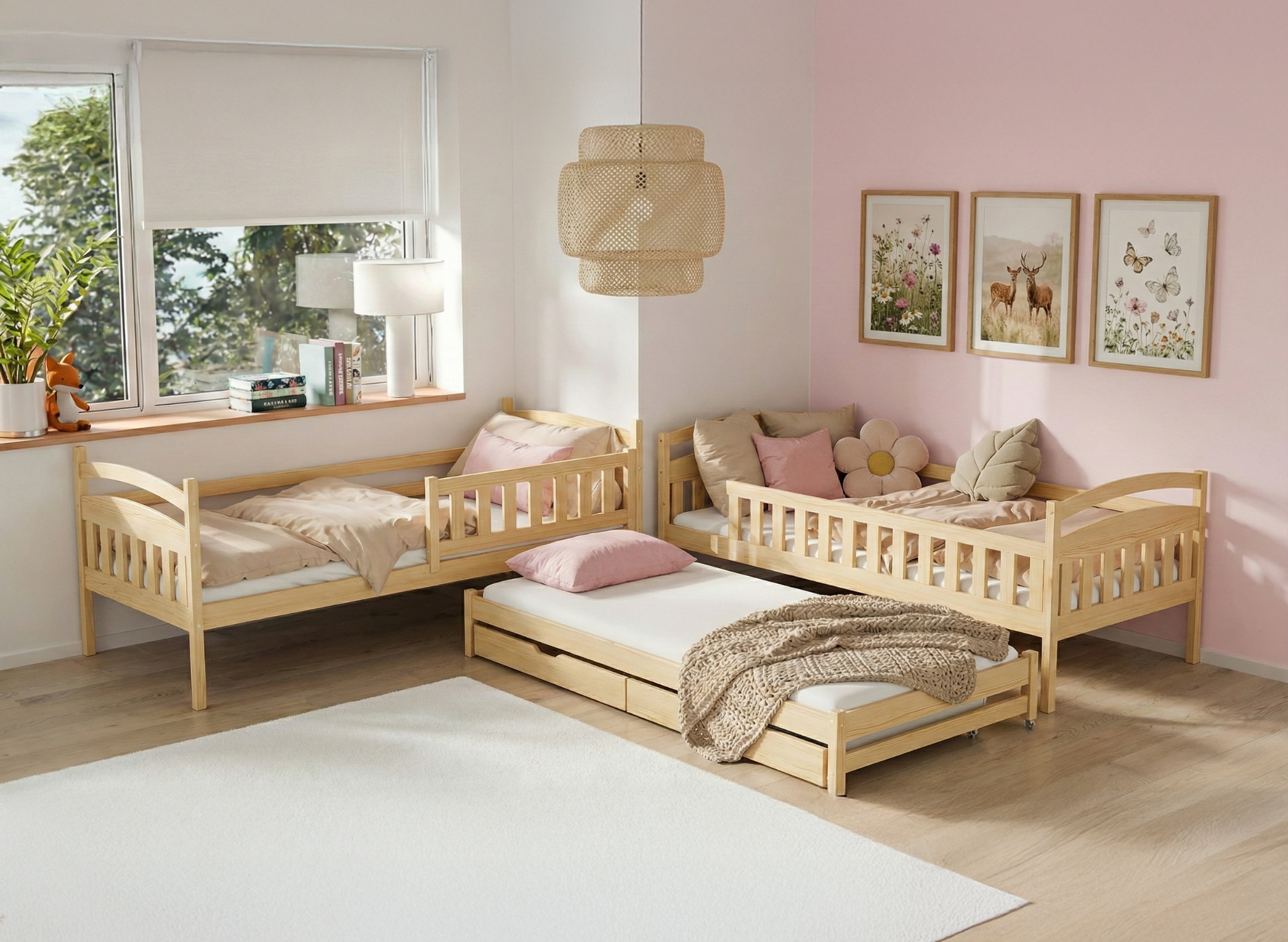U dołu łóżka piętrowego trzyosobowego BLANKA mogą znajdować się wysuwane szuflady, jeśli tylko zdecydujesz się na taki wariant. Ich pojemne wnętrze pomieści wiele rzeczy, które zagracają przestrzeń w pokoju dziecka, np. dawno nieużywane zabawki lub koce, po które sięgasz tylko zimą. Dodatkowy, wysuwany materac u dołu stanie się nieocenioną pomocą, gdy dziecko zaprosi na noc przyjaciół na wielkie nocowanie – zapewni gościom komfort bez konieczności sięgania po dodatkowe dmuchane materace.