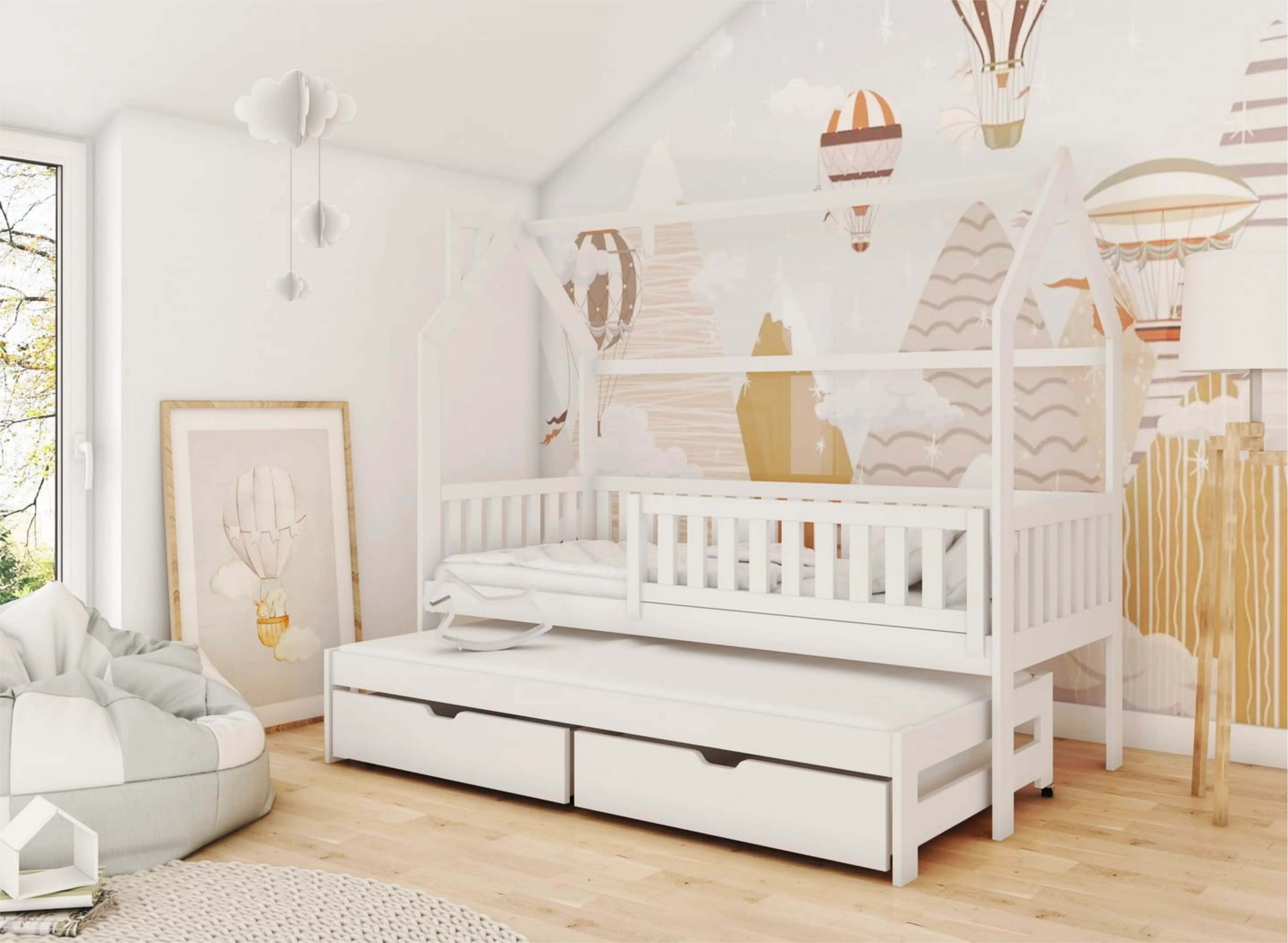 Z białym łóżkiem dziecięcym domek MONKEY przechowasz dziecięce zabawki i inne drobiazgi