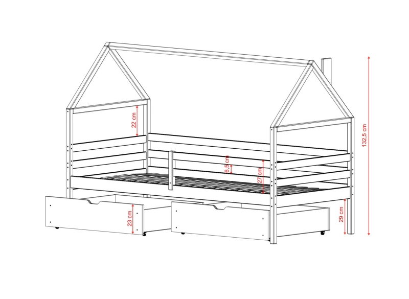 Łóżko dziecięce typu domek ARON od Lano Meble to spełnienie marzeń każdego dziecka. Jest to mebel wykonany w kształcie, który pobudzi kreatywność każdego malucha. Przemyślana konstrukcja, duża wytrzymałość i stabilność gwarantuje lata bezproblemowego użytkowania i uśmiech Twojej pociechy każdego dnia. W Lano Meble dużo uwagi poświęcamy nie tylko wizualnej stronie, ale także funkcjonalności. Łóżko dziecięce ARON to nie tylko wygodny mebel do spania, ale także możliwość przechowywania różnych akcesoriów dziecięcych. Pod łóżkiem jest wystarczająco miejsca, aby umieścić 2 pojemne szuflady. Możesz je dodatkowo nabyć, konfigurując produkt. Dobra zabawa oraz komfortowy wypoczynek gwarantowane.