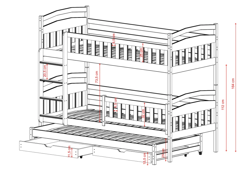 U dołu łóżka piętrowego trzyosobowego BLANKA mogą znajdować się wysuwane szuflady, jeśli tylko zdecydujesz się na taki wariant. Ich pojemne wnętrze pomieści wiele rzeczy, które zagracają przestrzeń w pokoju dziecka, np. dawno nieużywane zabawki lub koce, po które sięgasz tylko zimą. Dodatkowy, wysuwany materac u dołu stanie się nieocenioną pomocą, gdy dziecko zaprosi na noc przyjaciół na wielkie nocowanie – zapewni gościom komfort bez konieczności sięgania po dodatkowe dmuchane materace.