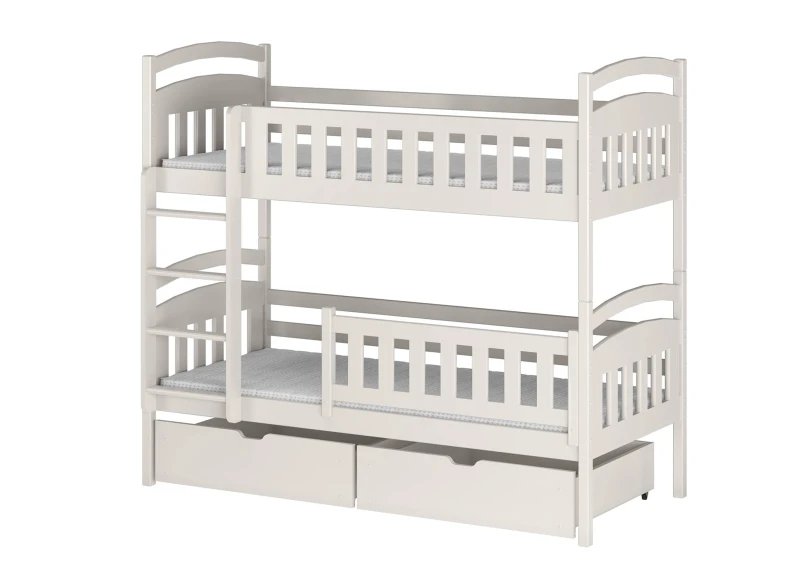 Miejsca do przechowywania nigdy dość. My również wychodzimy z takiego założenia, dlatego nasze łóżka są nie tylko pięknie i solidne, ale też praktyczne. Zamawiając łóżko piętrowe IGNAŚ, możesz dobrać pasujące stylem i charakterem szuflady. Ich szerokość i wysokość sprawia, że bez trudu schowasz tam zapasową pościel swoich dzieci. Szuflady wyposażone są w kółka, co znacząco ułatwia ich wysuwanie spod łóżek, a minimalistyczny uchwyt dodaje szufladom elegancji. Piętrowe łóżko IGNAŚ od Lano Meble, dostosowane jest do potrzeb również młodszych dzieci. Obydwie części łóżka wyposażone są w drewnianą barierkę, dlatego nawet te maleństwa, które śpią niespokojnie i podczas snu się wiercą, są bezpieczne. Jednak to nie wszystko, gdy Twoje dzieci podrosną, to z dolnej części szybko zdemontujesz barierkę, co ułatwi wchodzenie i schodzenie z łóżka.