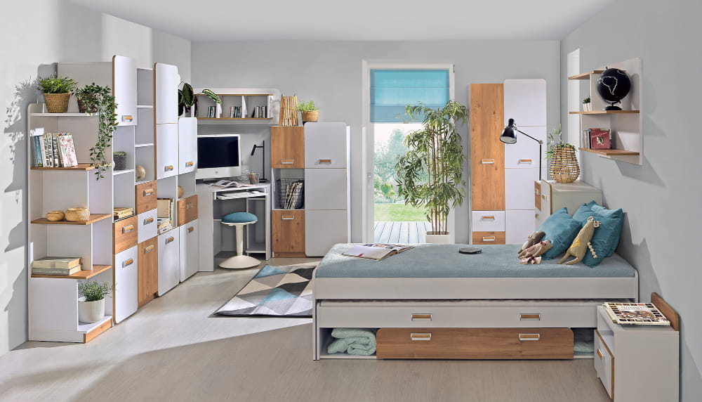 Urządź pokój swojego dziecka w sposób funkcjonalny i nowoczesny. Biurko narożne młodzieżowe LORENTO L11 to idealne rozwiązanie, które pozwala optymalnie wykorzystać każdy kąt pomieszczenia, co jest kluczowe w małych wnętrzach. To białe biurko narożne w kolorze biały brylantowy dąb nash doskonale wpasuje się w każde wnętrze, tworząc idealne miejsce do nauki i relaksu. To uniwersalne meble dla nastolatka, które rosną razem z nim.