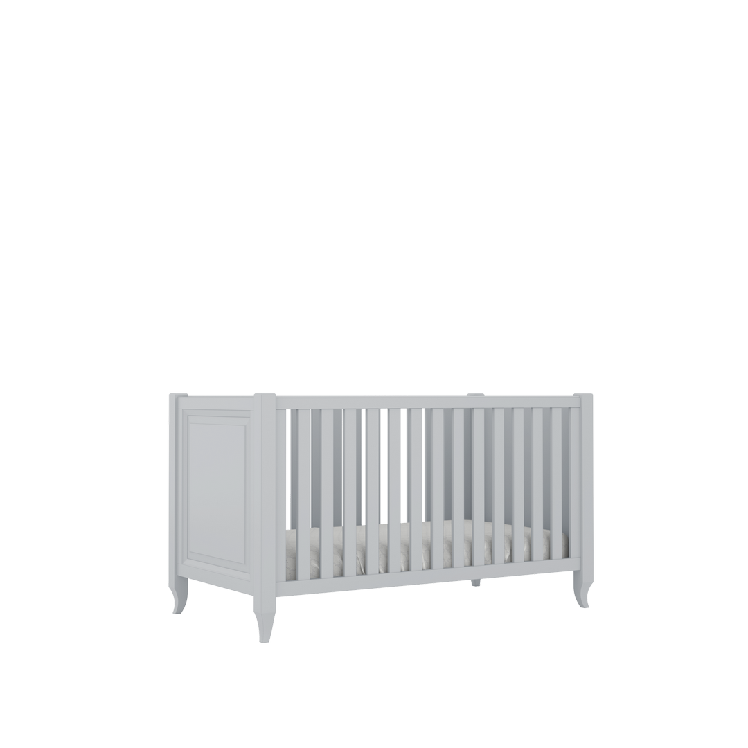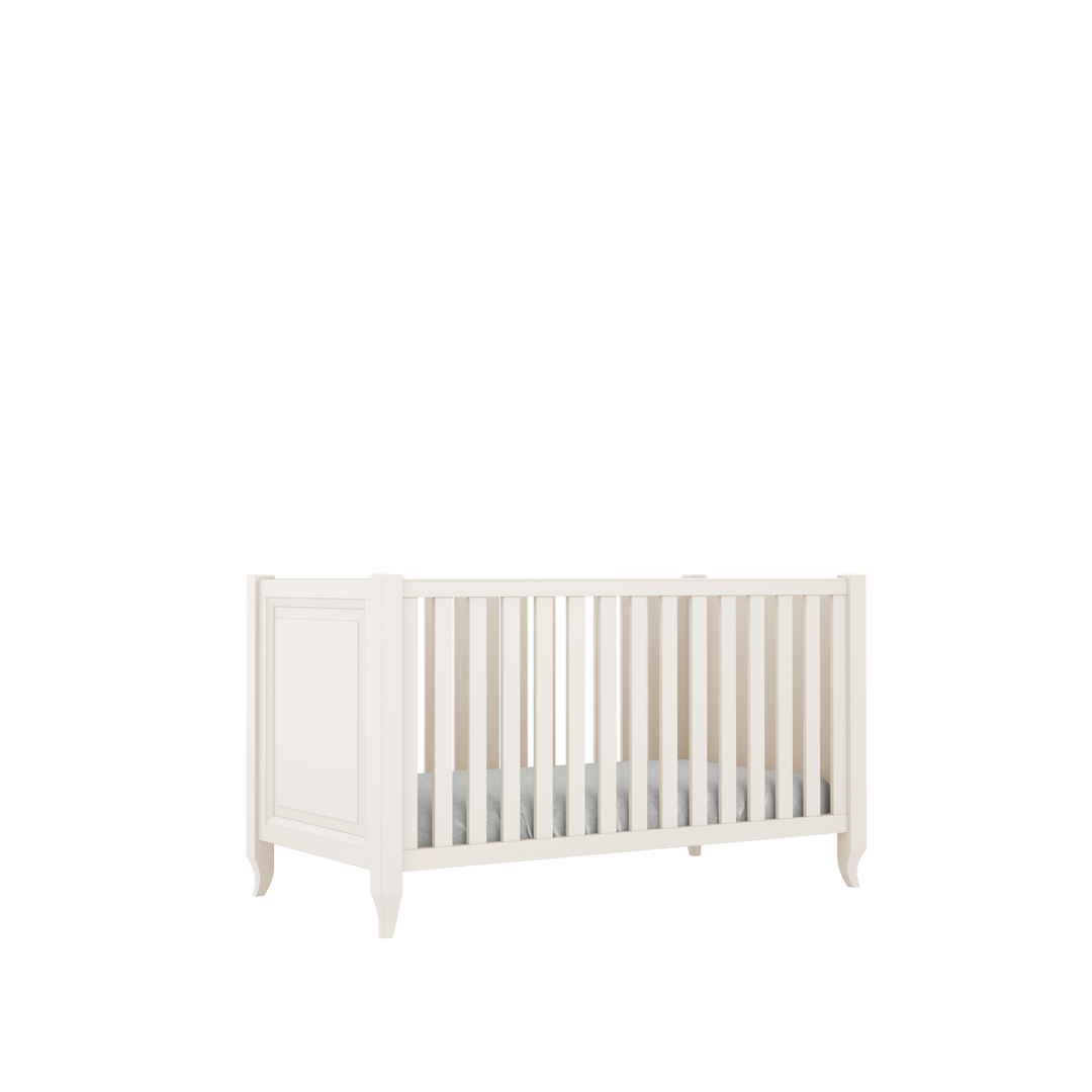 Elegancki mebel w stylu francuskim świetnie będzie komponował się w pokoju dziecięcym z szafą lub komodą. Łóżeczko posiada dwie również funkcję tapczanu za sprawą zdejmowanych bareirek. Istnieje możliwość zamontowania stelaża na 3 poziomach 44 cm, 37 cm, 21 cm. Łóżeczko wykonane zostało w kilku wariantach kolorystycznych. Dodatkowo spełnia normę PN/EN 1130/1/2001. Eleganckie frezowania oraz kryształowe uchwyty nadają elegancji i stylu co zachwyci każdego w różnym wieku. Meble wykonane z malowananej płyty MDF oraz drewna liściastego. Do produkcji użyto antyalergicznych farb ekologicznych i bezpiecznych dla dzieci.