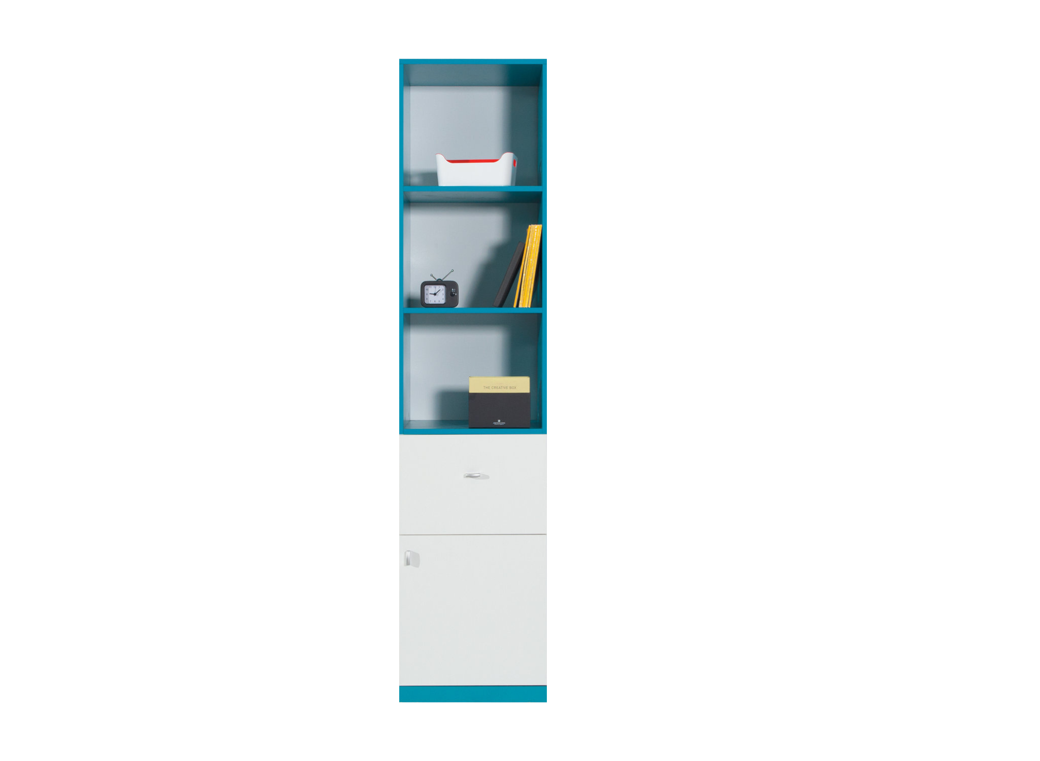 Regał MOBI 5 dostępny ze wstawkami w kolorze żółtym lub turkusowym do wyboru.