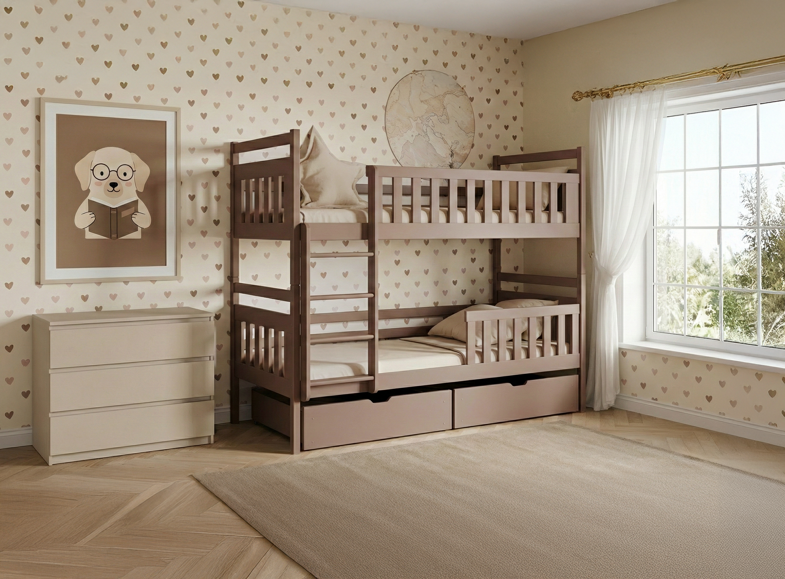 Łóżko piętrowe w kolorze mlecznej czekolady MONIKA 90x180 do małych i dużych pokoi dziecięcych