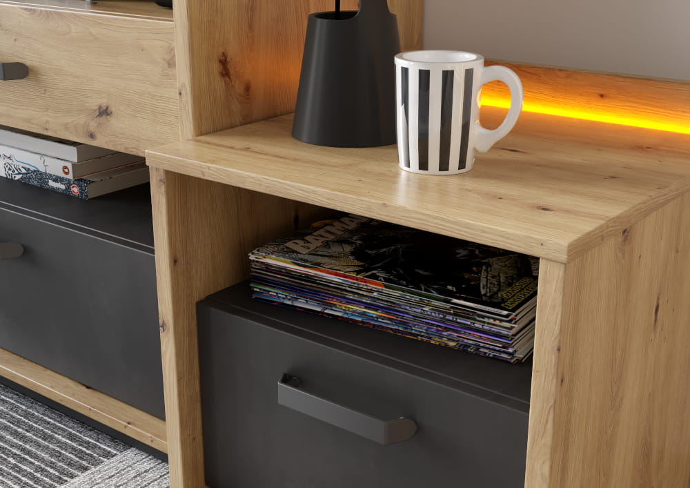 To nie jest zwykła, nudna biblioteczka. Qubic QB-06 wyróżnia się niebanalnym stylem. Połączenie ciepłego Dębu Artisan z surowymi akcentami Raw Steel (surowa stal) i Silk Flou tworzy modny, loftowy klimat. W zestawie otrzymujesz również oświetlenie LED, które wieczorem podświetla półki, tworząc w pokoju przytulną atmosferę.