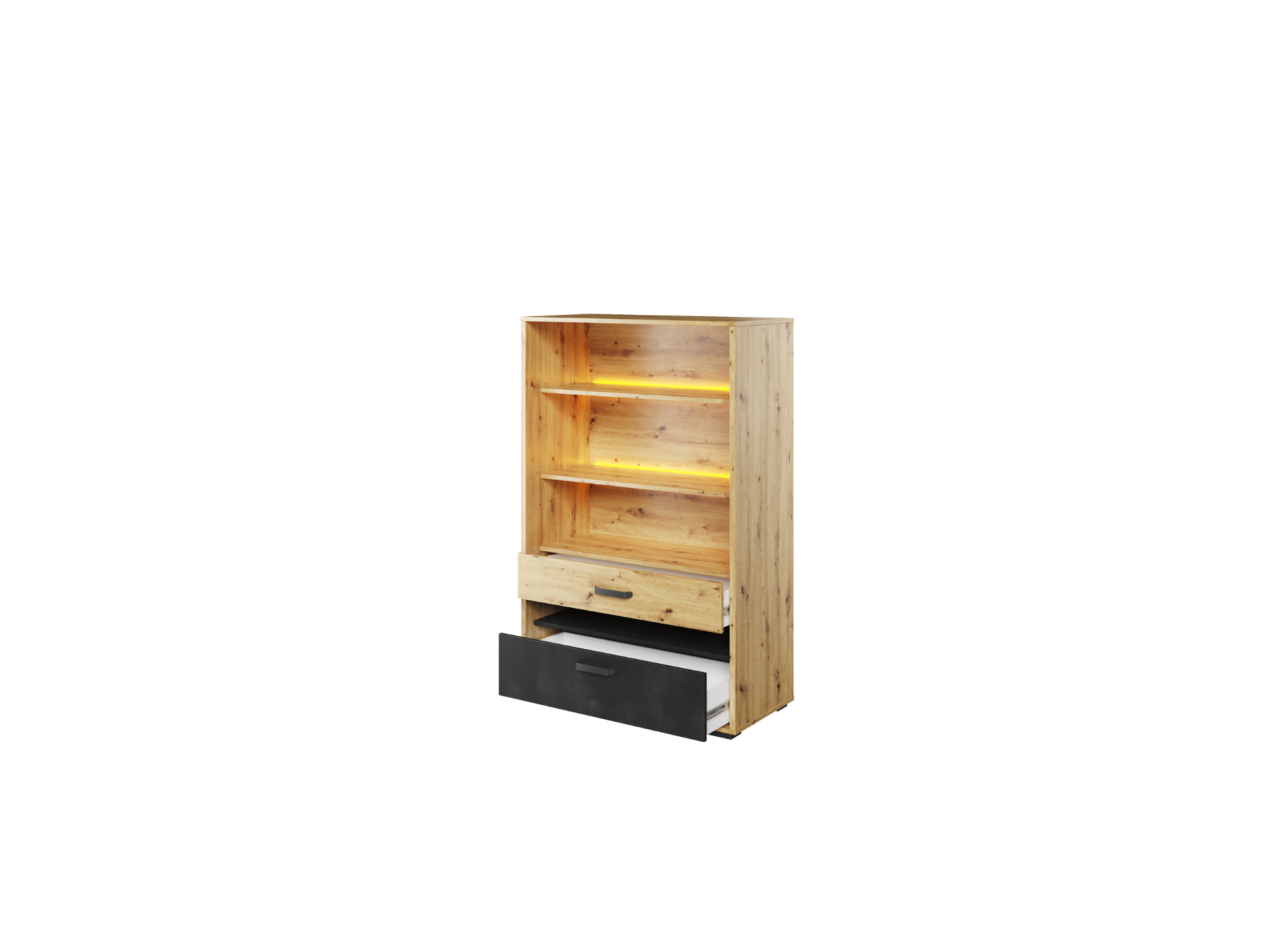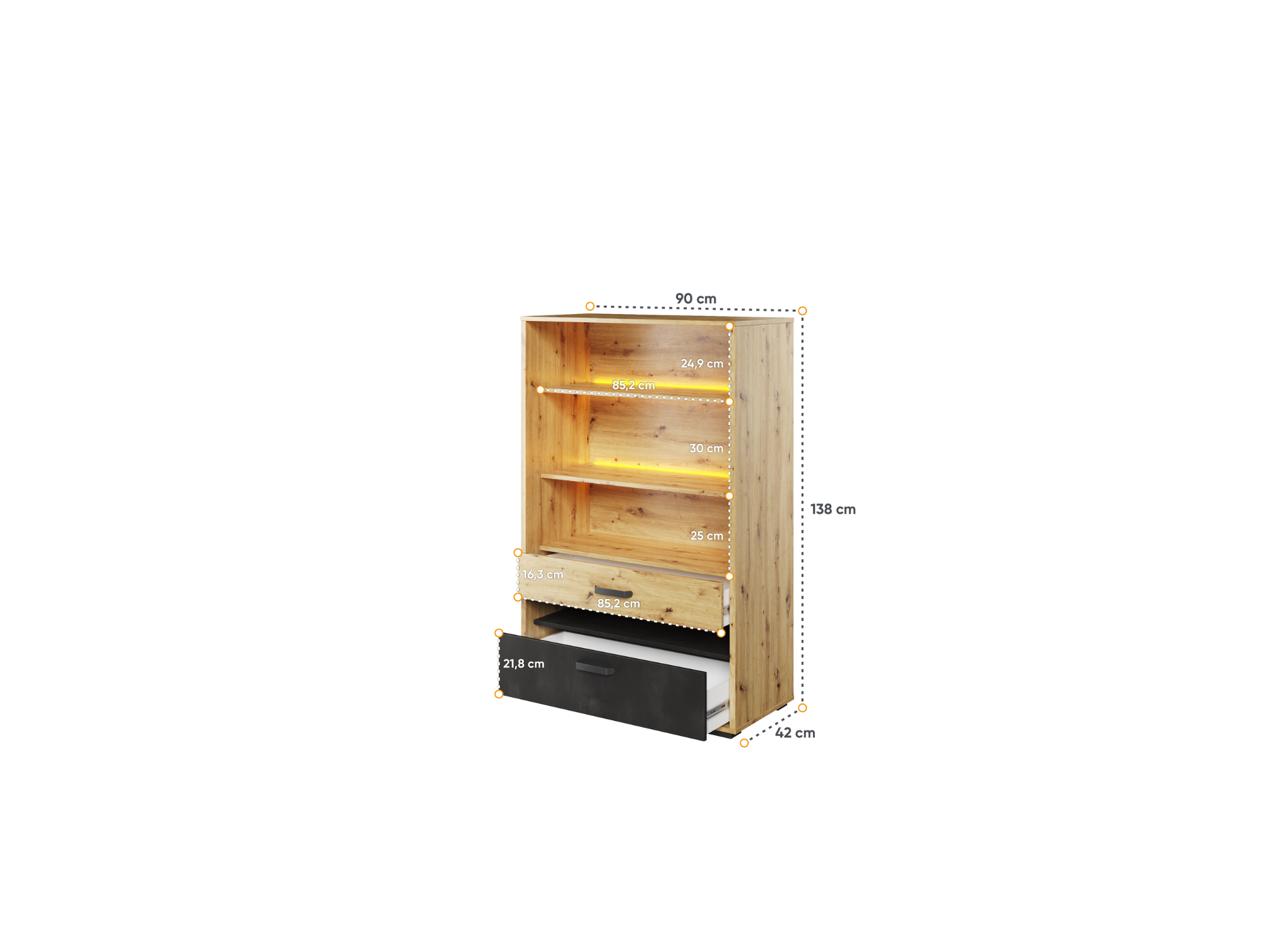 - Wyposażenie: 3 półki otwarte, 2 szuflady, oświetlenie LED