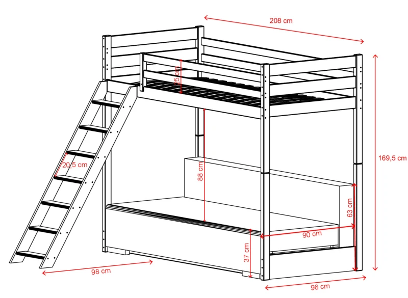 | Szerokość łóżka | 96/191 (całkowity wymiar po rozłożeniu z drabinką) |