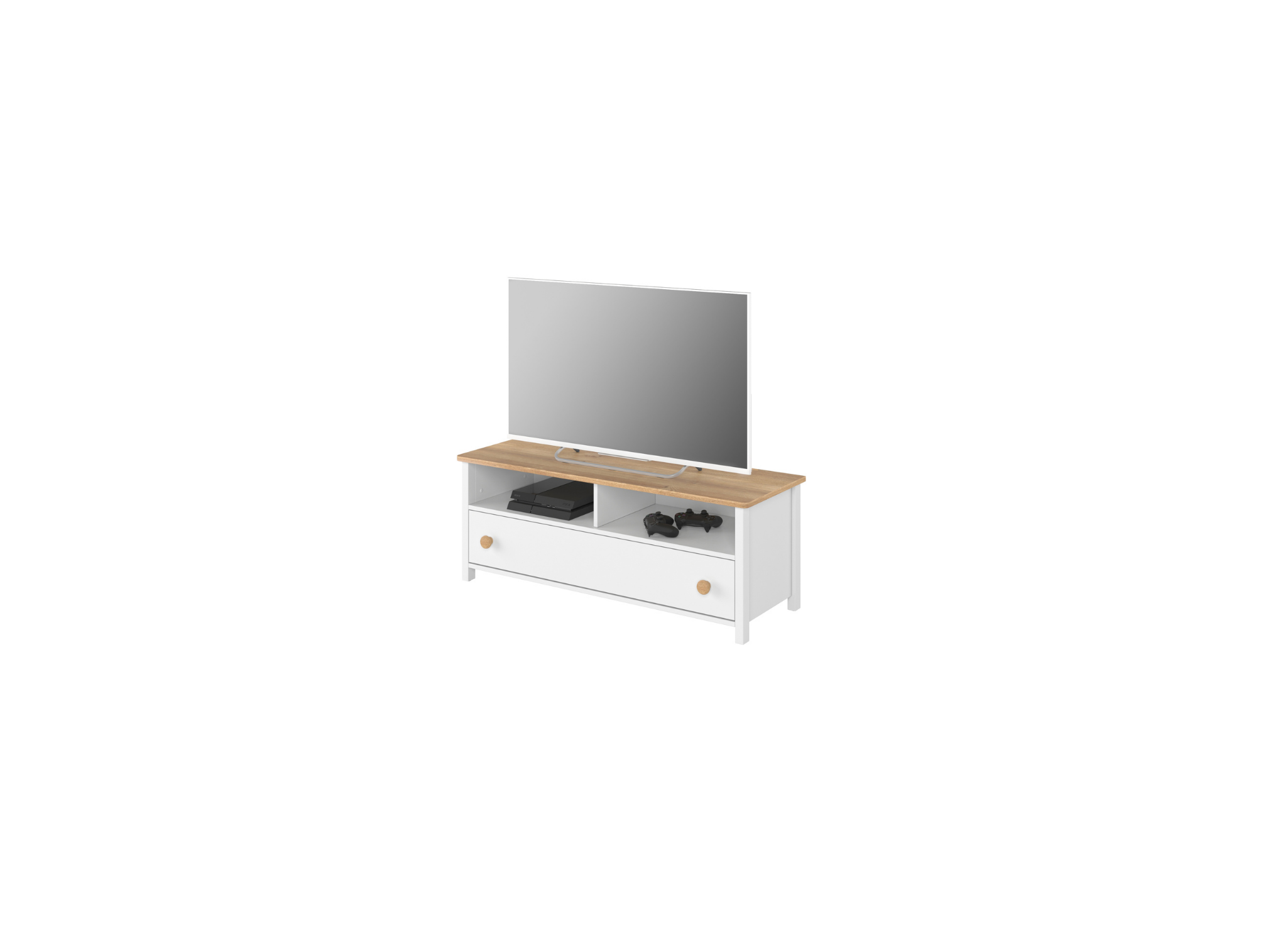 - Dwie otwarte wnęki: Idealne miejsce na konsolę do gier lub dekoder. Otwarta przestrzeń zapewnia odpowiednią wentylację sprzętu elektronicznego.